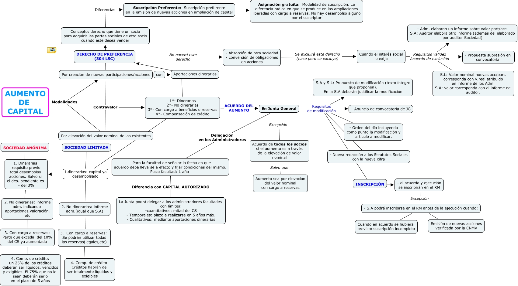 Este Cmap, tiene información relacionada con: Escenario 8, En Junta General Excepción Acuerdo de todos los socios si el aumento es a través de la elevación de valor nominal, - S.A podrá inscribirse en el RM antes de la ejecución cuando: ???? Emisión de nuevas acciones verificada por la CNMV, En Junta General Requisitos de modificación - Nueva redacción a los Estatutos Sociales con la nueva cifra, Aportaciones dinerarias ???? DERECHO DE PREFERENCIA (304 LSC), AUMENTO DE CAPITAL Modalidades Por creación de nuevas participaciones/acciones, Por creación de nuevas participaciones/acciones ???? Concepto: derecho que tiene un socio para adquirir las partes sociales de otro socio cuando éste desea vender, 1*- Dinerarias 2*- No dinerarias 3*- Con cargo a beneficios o reservas 4*- Compensación de crédito ACUERDO DEL AUMENTO En Junta General, Cuando el interés social lo exija Requisitos validez Acuerdo de exclusión - Propuesta supresión en convocatoria, 1*- Dinerarias 2*- No dinerarias 3*- Con cargo a beneficios o reservas 4*- Compensación de crédito 1.dinerarias: capital ya desembolsado 2. No dinerarias: informe adm.(igual que S.A), AUMENTO DE CAPITAL Modalidades Por elevación del valor nominal de las existentes, DERECHO DE PREFERENCIA (304 LSC) No nacerá este derecho - Absorción de otra sociedad - conversión de obligaciones en acciones, SOCIEDAD ANÓNIMA ???? 1. Dinerarias: requisito previo total desembolso acciones. Salvo si el des. pendiente es - del 3%, En Junta General Requisitos de modificación - Anuncio de convocatoria de JG, Acuerdo de todos los socios si el aumento es a través de la elevación de valor nominal Salvo que Aumento sea por elevación del valor nominal con cargo a reservas, SOCIEDAD LIMITADA 1.dinerarias: capital ya desembolsado 2. No dinerarias: informe adm.(igual que S.A), - Para la facultad de señalar la fecha en que acuerdo deba llevarse a efecto y fijar condiciones del mismo. Plazo facultad: 1 año Diferencia con CAPITAL AUTORIZADO La Junta podrá delegar a los administradores facultades con límites: -cuantitativos: mitad del CS - Temporales: plazo a realizarse en 5 años máx. - Cualitativos: mediante aportaciones dinerarias, 3. Con cargo a reservas: Se podrán utilizar todas las reservas(legales,etc) ???? 4. Comp. de crédito: Créditos habrán de ser totalmente líquidos y exigibles, En Junta General Delegación en los Administradores - Para la facultad de señalar la fecha en que acuerdo deba llevarse a efecto y fijar condiciones del mismo. Plazo facultad: 1 año, - Absorción de otra sociedad - conversión de obligaciones en acciones Se excluirá este derecho (nace pero se excluye) Cuando el interés social lo exija, SOCIEDAD LIMITADA 1.dinerarias: capital ya desembolsado 1. Dinerarias: requisito previo total desembolso acciones. Salvo si el des. pendiente es - del 3%