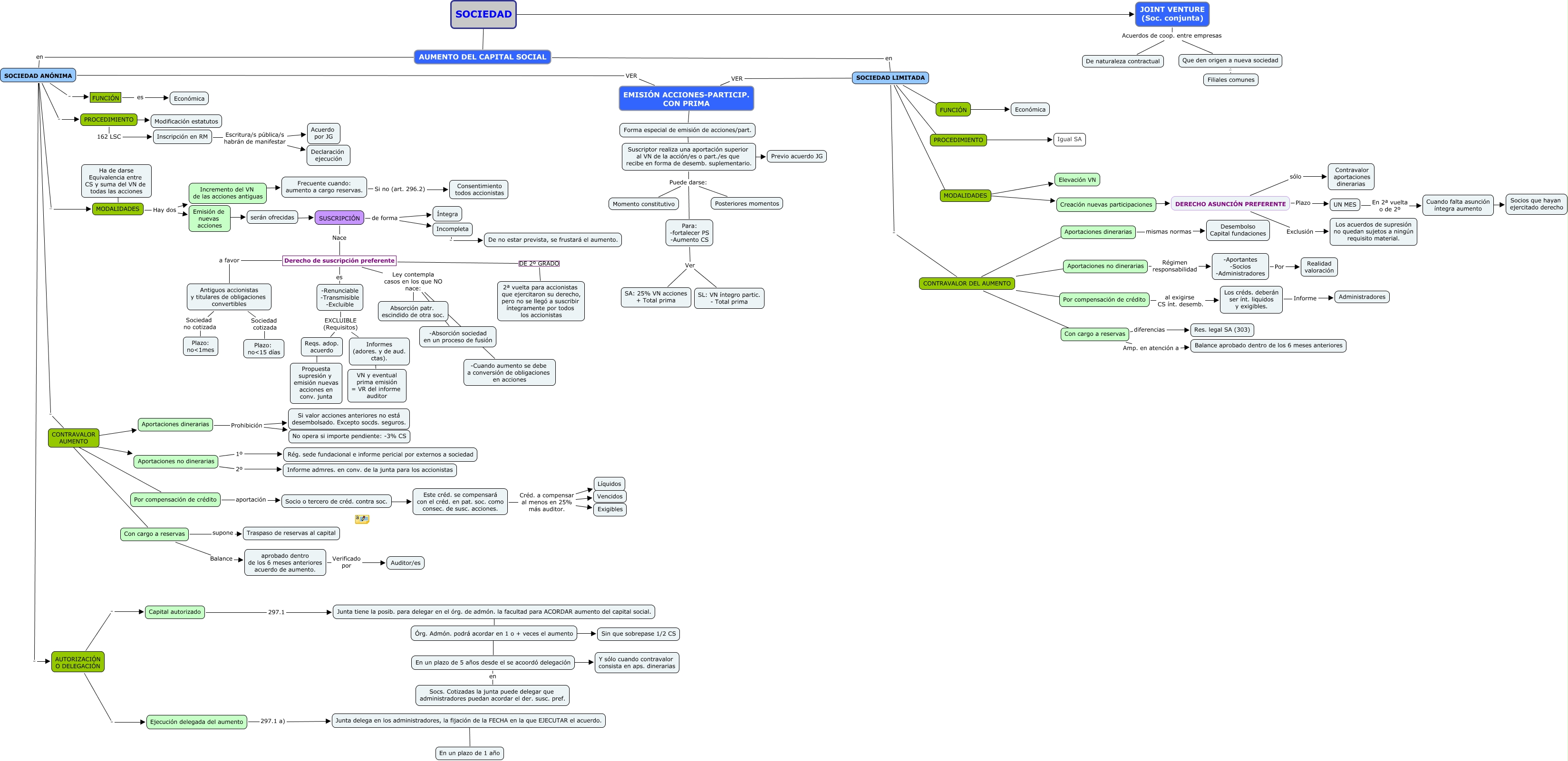Este Cmap, tiene información relacionada con: Cynthia_Lara_M3_Familia Gras Fortuny_ Caso 8, SOCIEDAD LIMITADA ???? PROCEDIMIENTO, Derecho de suscripción preferente Ley contempla casos en los que NO nace: Absorción patr. escindido de otra soc., SOCIEDAD ANÓNIMA . FUNCIÓN, CONTRAVALOR AUMENTO ???? Con cargo a reservas, Reqs. adop. acuerdo ???? Propuesta supresión y emisión nuevas acciones en conv. junta, Por compensación de crédito aportación Socio o tercero de créd. contra soc., CONTRAVALOR DEL AUMENTO ???? Aportaciones dinerarias, SUSCRIPCIÓN Nace Derecho de suscripción preferente, Con cargo a reservas diferencias Res. legal SA (303), PROCEDIMIENTO ???? Igual SA, Derecho de suscripción preferente a favor Antiguos accionistas y titulares de obligaciones convertibles, CONTRAVALOR DEL AUMENTO ???? Por compensación de crédito, DERECHO ASUNCIÓN PREFERENTE Exclusión Los acuerdos de supresión no quedan sujetos a ningún requisito material., AUMENTO DEL CAPITAL SOCIAL en SOCIEDAD ANÓNIMA, Incremento del VN de las acciones antiguas ???? Frecuente cuando: aumento a cargo reservas., SUSCRIPCIÓN de forma Incompleta, Emisión de nuevas acciones ? serán ofrecidas, SOCIEDAD ???? JOINT VENTURE (Soc. conjunta), Junta tiene la posib. para delegar en el órg. de admón. la facultad para ACORDAR aumento del capital social. ???? Órg. Admón. podrá acordar en 1 o + veces el aumento, SOCIEDAD ANÓNIMA . AUTORIZACIÓN O DELEGACIÓN