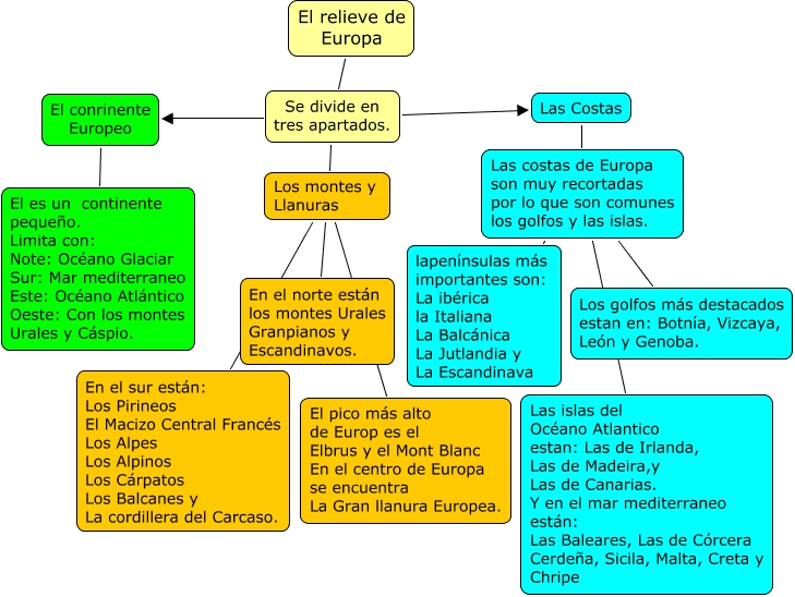 Este Cmap, tiene información relacionada con: El relieve de Europa, Se divide en tres apartados. Los montes y Llanuras, Los montes y Llanuras En el norte están los montes Urales Granpianos y Escandinavos., El relieve de Europa Se divide en tres apartados., Las costas de Europa son muy recortadas por lo que son comunes los golfos y las islas. Las islas del Océano Atlantico estan: Las de Irlanda, Las de Madeira,y Las de Canarias. Y en el mar mediterraneo están: Las Baleares, Las de Córcera Cerdeña, Sicila, Malta, Creta y Chripe, El conrinente Europeo El es un continente pequeño. Limita con: Note: Océano Glaciar Sur: Mar mediterraneo Este: Océano Atlántico Oeste: Con los montes Urales y Cáspio., Las costas de Europa son muy recortadas por lo que son comunes los golfos y las islas. lapenínsulas más importantes son: La ibérica la Italiana La Balcánica La Jutlandia y La Escandinava, Las Costas Las costas de Europa son muy recortadas por lo que son comunes los golfos y las islas., Se divide en tres apartados. El conrinente Europeo, Las costas de Europa son muy recortadas por lo que son comunes los golfos y las islas. Los golfos más destacados estan en: Botnía, Vizcaya, León y Genoba., Se divide en tres apartados. Las Costas, Los montes y Llanuras En el sur están: Los Pirineos El Macizo Central Francés Los Alpes Los Alpinos Los Cárpatos Los Balcanes y La cordillera del Carcaso., Los montes y Llanuras El pico más alto de Europ es el Elbrus y el Mont Blanc En el centro de Europa se encuentra La Gran llanura Europea.