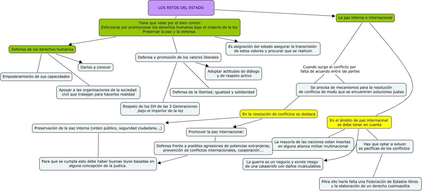 Este Cmap, tiene información relacionada con: Filosofía Los retos del Estado Óscar Ferrando, Defensa y promoción de los valores liberales Adoptar actitudes de diálogo y de respeto activo, Defensa frente a posibles agresiones de potencias extranjeras, prevención de conflictos internacionales, cooperación... Para que se cumpla esto debe haber buenas leyes basadas en alguna concepción de la justica., Promover la paz internacional: Defensa frente a posibles agresiones de potencias extranjeras, prevención de conflictos internacionales, cooperación..., En la resolución de conflictos se destaca Preservación de la paz interna (orden público, seguridad ciudadana...), En el ámbito de paz internacinal se debe tenar en cuenta Hay que optar a soluon es pacíficas de los conflictos, La paz interna e internacional En el ámbito de paz internacinal se debe tenar en cuenta, Defensa y promoción de los valores liberales Defensa de la libertad, igualdad y solidaridad, La paz interna e internacional Cuando surge el conflicto por falta de acuerdo entre las partes En la resolución de conflictos se destaca, En el ámbito de paz internacinal se debe tenar en cuenta La mayoría de las naciones estan insertas en alguna alianza militar multinacional, Defensa de los derechos humanos Darlos a conocer, Tiene que velar por el bien común Esforzarse por promocionar los derechos humanos bajo el imperio de la ley Preservar la paz y la defensa. Defensa de los derechos humanos, Tiene que velar por el bien común Esforzarse por promocionar los derechos humanos bajo el imperio de la ley Preservar la paz y la defensa. Defensa y promoción de los valores liberales, Preservación de la paz interna (orden público, seguridad ciudadana...) Para que se cumpla esto debe haber buenas leyes basadas en alguna concepción de la justica., Defensa de los derechos humanos Apoyar a las organizaciones de la sociedad civil que trabajan para hacerlos realidad, Tiene que velar por el bien común Esforzarse por promocionar los derechos humanos bajo el imperio de la ley Preservar la paz y la defensa. Es asignación del estado asegurar la transmisión de estos valores y procurar que se realicen, Defensa y promoción de los valores liberales Respeto de los DH de las 3 Generaciones ,bajo el imperior de la ley, En el ámbito de paz internacinal se debe tenar en cuenta La guerra es un negocio y exixte riesgo de una catastrofe con daños incalculables, En la resolución de conflictos se destaca Promover la paz internacional:, La paz interna e internacional Cuando surge el conflicto por falta de acuerdo entre las partes Se precisa de mecanismos para la resolución de conflicos de modo que se encuentren soluciones justas, LOS RETOS DEL ESTADO Tiene que velar por el bien común Esforzarse por promocionar los derechos humanos bajo el imperio de la ley Preservar la paz y la defensa.