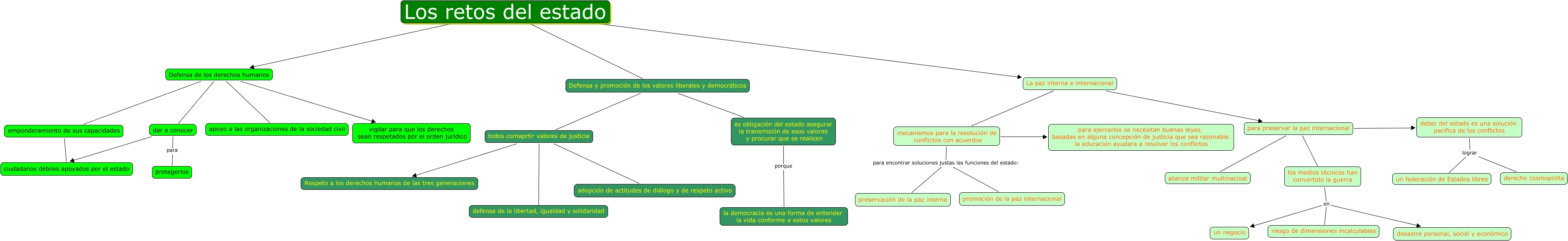 Este Cmap, tiene información relacionada con: retos del estado, emponderamiento de sus capacidades ciudadanos débiles apoyados por el estado, Defensa de los derechos humanos emponderamiento de sus capacidades, Defensa de los derechos humanos dar a conocer, es obligación del estado asegurar la transmisión de esos valores y procurar que se realicen porque la democracia es una forma de entender la vida conforme a estos valores, Los retos del estado Defensa de los derechos humanos, La paz interna e internacional para preservar la paz internacional, Los retos del estado Defensa y promoción de los valores liberales y democráticos, mecanismos para la resolución de conflictos con acuerdos para ejercerlos se necesitan buenas leyes, basadas en alguna concepción de justicia que sea razonable. la educación ayudara a resolver los conflictos, Defensa de los derechos humanos vigilar para que los derechos sean respetados por el orden jurídico, para preservar la paz internacional deber del estado es una solución pacífica de los conflictos, Defensa y promoción de los valores liberales y democráticos todos comaprtir valores de justicia, para preservar la paz internacional alianza militar multinacinal, todos comaprtir valores de justicia adopción de actitudes de diálogo y de respeto activo, para preservar la paz internacional los medios técnicos han convertido la guerra, dar a conocer ciudadanos débiles apoyados por el estado, mecanismos para la resolución de conflictos con acuerdos para encontrar soluciones justas las funciones del estado: promoción de la paz internacional, todos comaprtir valores de justicia defensa de la libertad, igualdad y solidaridad, mecanismos para la resolución de conflictos con acuerdos para encontrar soluciones justas las funciones del estado: preservación de la paz interna, los medios técnicos han convertido la guerra en desastre personal, social y económico, La paz interna e internacional mecanismos para la resolución de conflictos con acuerdos