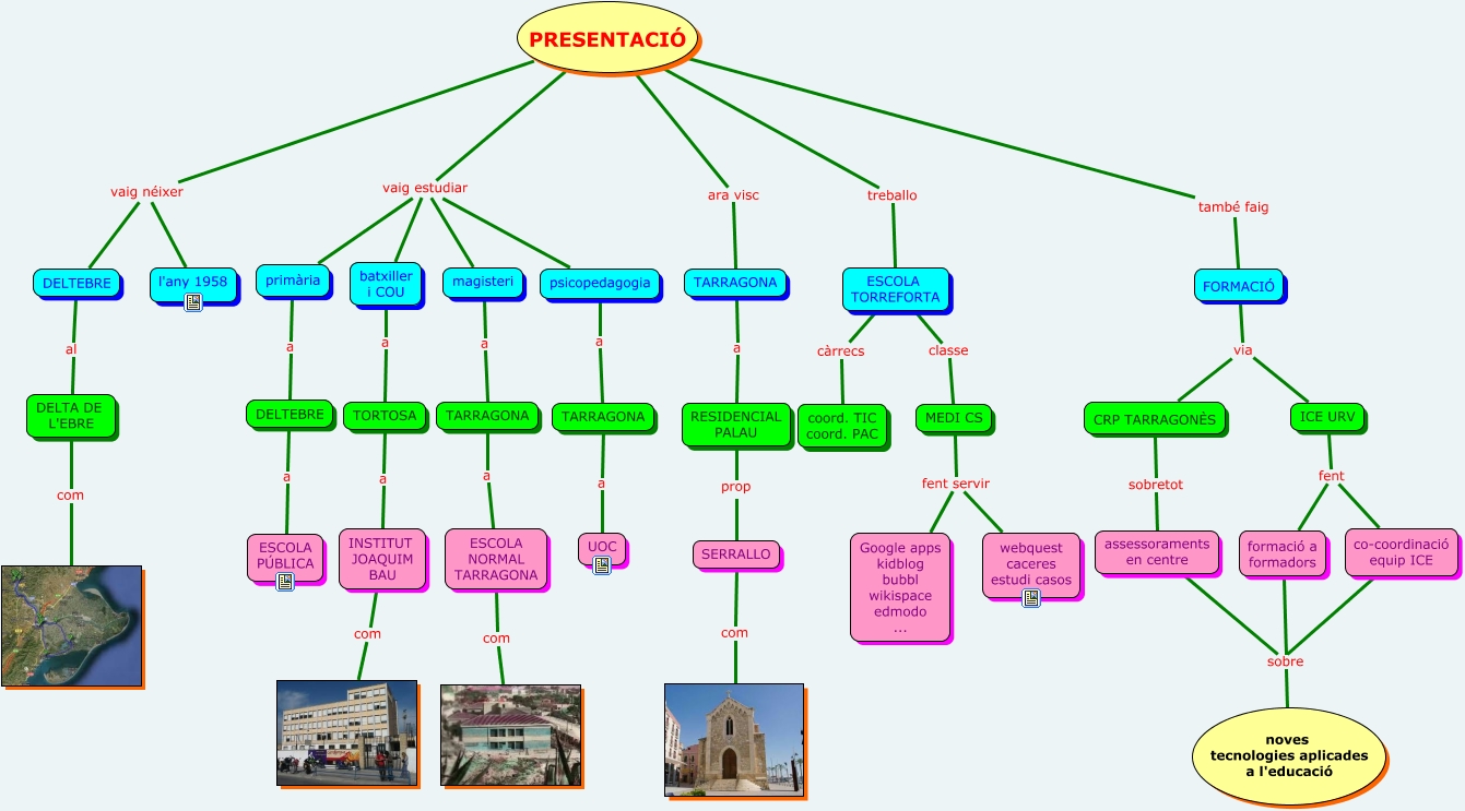 Aquest mapa conceptual conté informació relacionada amb: PRESENTACIÓ, CRP TARRAGONÈS sobretot assessoraments en centre, FORMACIÓ via ICE URV, co-coordinació equip ICE sobre noves tecnologies aplicades a l'educació, MEDI CS fent servir webquest caceres estudi casos, assessoraments en centre sobre noves tecnologies aplicades a l'educació, PRESENTACIÓ vaig néixer l'any 1958, MEDI CS fent servir Google apps kidblog bubbl wikispace edmodo ..., SERRALLO com, ESCOLA TORREFORTA classe MEDI CS, PRESENTACIÓ vaig néixer DELTEBRE, TORTOSA a INSTITUT JOAQUIM BAU, ESCOLA TORREFORTA càrrecs coord. TIC coord. PAC, PRESENTACIÓ treballo ESCOLA TORREFORTA, DELTEBRE al DELTA DE L'EBRE, formació a formadors sobre noves tecnologies aplicades a l'educació, TARRAGONA a RESIDENCIAL PALAU, PRESENTACIÓ també faig FORMACIÓ, PRESENTACIÓ vaig estudiar magisteri, primària a DELTEBRE, TARRAGONA a ESCOLA NORMAL TARRAGONA