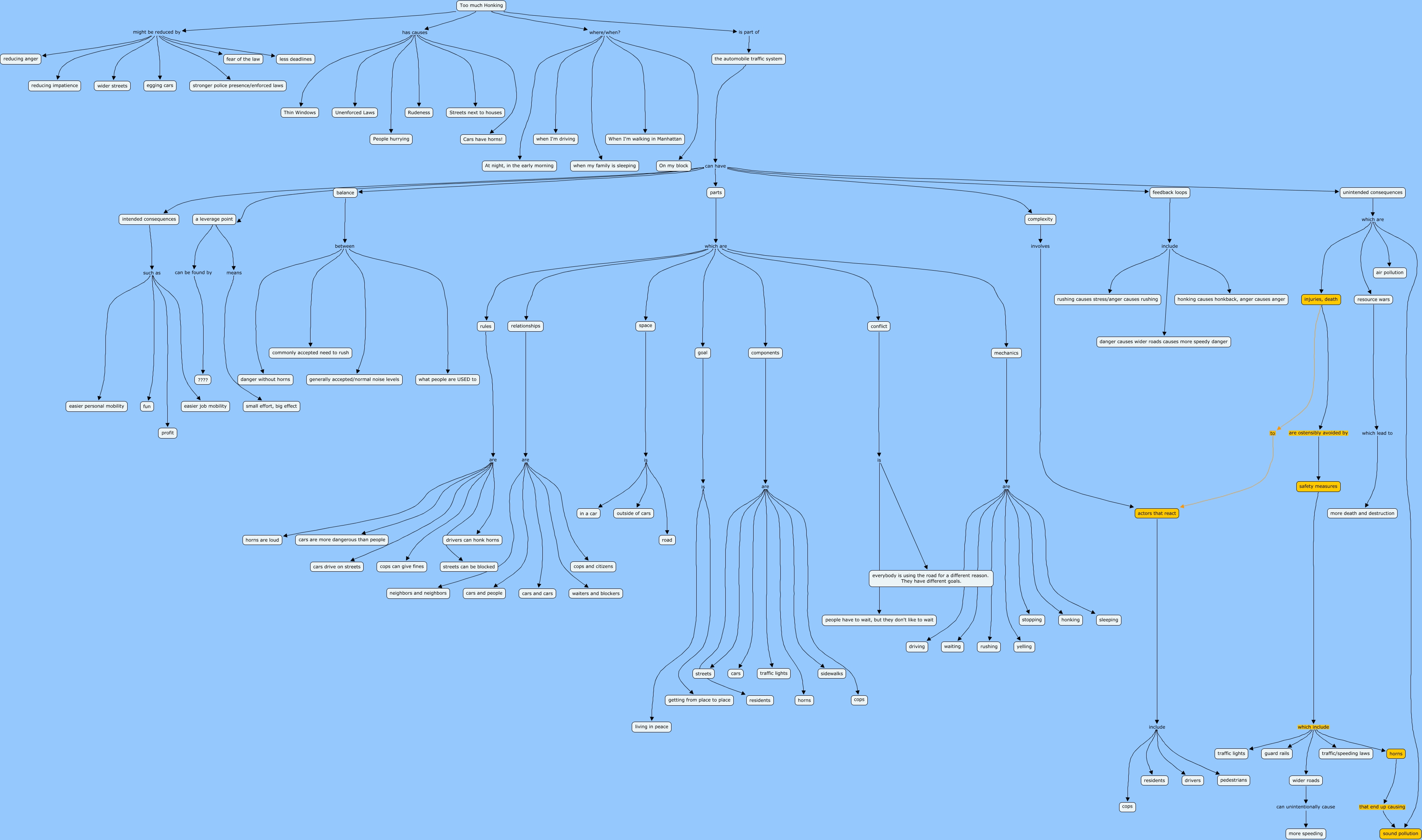 This Concept Map, created with IHMC CmapTools, has information related to: boss-level-8-tri3-systems-example, parts which are relationships, mechanics are yelling, parts which are components, unintended consequences which are sound pollution, Too much Honking has causes Rudeness, mechanics are driving, the automobile traffic system can have feedback loops, rules are cars drive on streets, balance between what people are USED to, Too much Honking where/when? On my block, rules are cops can give fines, the automobile traffic system can have balance, rules are drivers can honk horns, goal is getting from place to place, Too much Honking has causes Unenforced Laws, space is road, rules are horns are loud, Too much Honking where/when? At night, in the early morning, balance between generally accepted/normal noise levels, a leverage point can be found by ????
