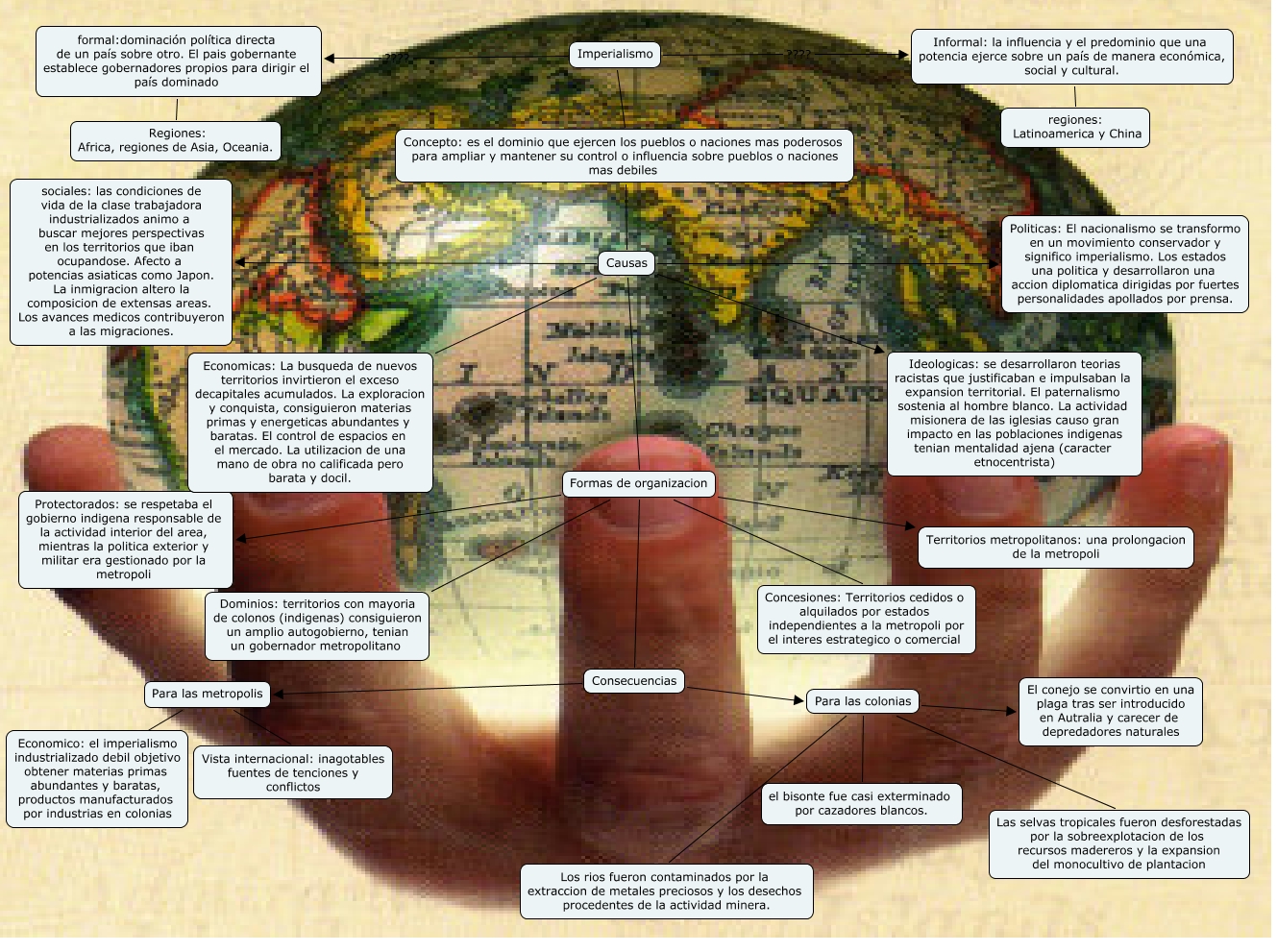 Este Cmap, tiene información relacionada con: Imperialismo.cmap 3, Causas sociales: las condiciones de vida de la clase trabajadora industrializados animo a buscar mejores perspectivas en los territorios que iban ocupandose. Afecto a potencias asiaticas como Japon. La inmigracion altero la composicion de extensas areas. Los avances medicos contribuyeron a las migraciones., Causas Economicas: La busqueda de nuevos territorios invirtieron el exceso decapitales acumulados. La exploracion y conquista, consiguieron materias primas y energeticas abundantes y baratas. El control de espacios en el mercado. La utilizacion de una mano de obra no calificada pero barata y docil., Informal: la influencia y el predominio que una potencia ejerce sobre un país de manera económica, social y cultural. regiones: Latinoamerica y China, Consecuencias Para las colonias, Causas Ideologicas: se desarrollaron teorias racistas que justificaban e impulsaban la expansion territorial. El paternalismo sostenia al hombre blanco. La actividad misionera de las iglesias causo gran impacto en las poblaciones indigenas tenian mentalidad ajena (caracter etnocentrista), Causas Politicas: El nacionalismo se transformo en un movimiento conservador y significo imperialismo. Los estados una politica y desarrollaron una accion diplomatica dirigidas por fuertes personalidades apollados por prensa., Formas de organizacion Protectorados: se respetaba el gobierno indigena responsable de la actividad interior del area, mientras la politica exterior y militar era gestionado por la metropoli, Causas Formas de organizacion, Formas de organizacion Dominios: territorios con mayoria de colonos (indigenas) consiguieron un amplio autogobierno, tenian un gobernador metropolitano, Imperialismo ???? Informal: la influencia y el predominio que una potencia ejerce sobre un país de manera económica, social y cultural., Imperialismo ???? formal:dominación política directa de un país sobre otro. El pais gobernante establece gobernadores propios para dirigir el país dominado, Formas de organizacion Concesiones: Territorios cedidos o alquilados por estados independientes a la metropoli por el interes estrategico o comercial, Para las colonias Los rios fueron contaminados por la extraccion de metales preciosos y los desechos procedentes de la actividad minera., Concepto: es el dominio que ejercen los pueblos o naciones mas poderosos para ampliar y mantener su control o influencia sobre pueblos o naciones mas debiles Causas, Formas de organizacion Consecuencias, Formas de organizacion Territorios metropolitanos: una prolongacion de la metropoli, Para las colonias el bisonte fue casi exterminado por cazadores blancos., Para las colonias Las selvas tropicales fueron desforestadas por la sobreexplotacion de los recursos madereros y la expansion del monocultivo de plantacion, Imperialismo Concepto: es el dominio que ejercen los pueblos o naciones mas poderosos para ampliar y mantener su control o influencia sobre pueblos o naciones mas debiles, Para las metropolis ???? Economico: el imperialismo industrializado debil objetivo obtener materias primas abundantes y baratas, productos manufacturados por industrias en colonias