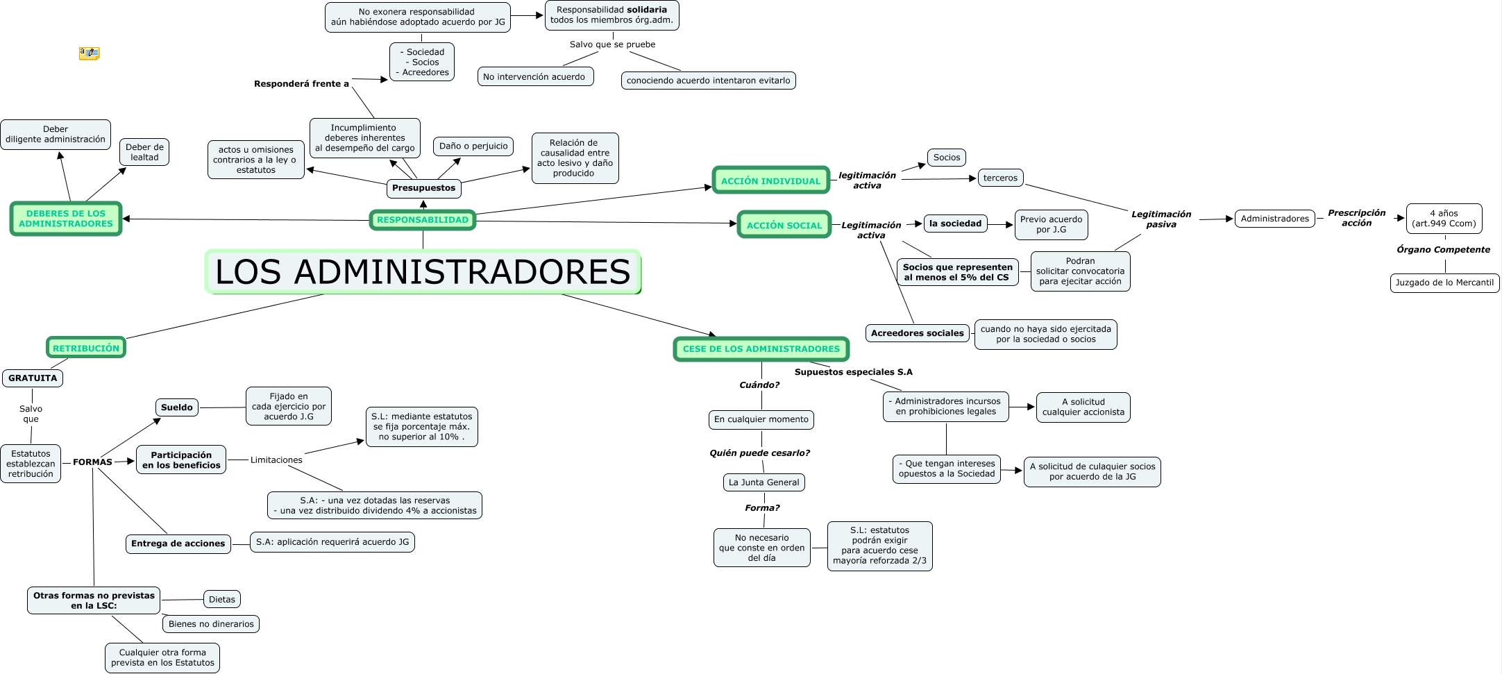 Aquest mapa conceptual conté informació relacionada amb: Escenario 9, Estatutos establezcan retribución FORMAS Entrega de acciones, LOS ADMINISTRADORES RESPONSABILIDAD Presupuestos, - Sociedad - Socios - Acreedores ???? No exonera responsabilidad aún habiéndose adoptado acuerdo por JG, - Administradores incursos en prohibiciones legales ???? A solicitud cualquier accionista, En cualquier momento Quién puede cesarlo? La Junta General, Presupuestos ???? Daño o perjuicio, LOS ADMINISTRADORES RESPONSABILIDAD DEBERES DE LOS ADMINISTRADORES, ACCIÓN SOCIAL Legitimación activa Acreedores sociales, LOS ADMINISTRADORES ???? CESE DE LOS ADMINISTRADORES, la sociedad ???? Previo acuerdo por J.G, LOS ADMINISTRADORES RETRIBUCIÓN GRATUITA, ACCIÓN INDIVIDUAL legitimación activa terceros, Presupuestos ???? actos u omisiones contrarios a la ley o estatutos, Participación en los beneficios Limitaciones S.L: mediante estatutos se fija porcentaje máx. no superior al 10% ., Acreedores sociales ???? cuando no haya sido ejercitada por la sociedad o socios, Presupuestos Responderá frente a - Sociedad - Socios - Acreedores, No necesario que conste en orden del día ???? S.L: estatutos podrán exigir para acuerdo cese mayoría reforzada 2/3, - Administradores incursos en prohibiciones legales ???? - Que tengan intereses opuestos a la Sociedad, DEBERES DE LOS ADMINISTRADORES ???? Deber diligente administración, Otras formas no previstas en la LSC: ???? Dietas