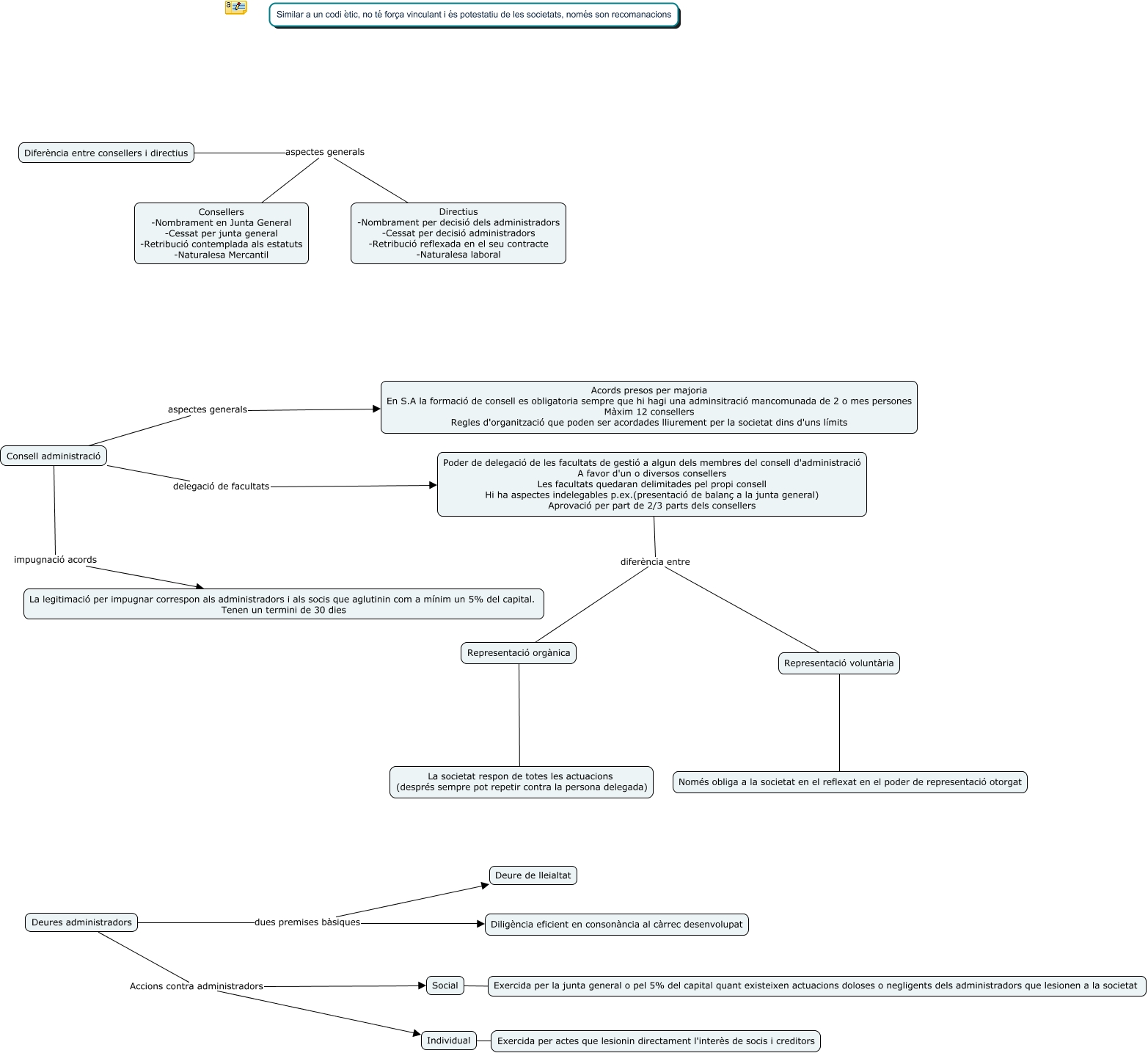 Esse mapa conceitual, produzido no IHMC CmapTools, tem a informação relacionada a: cmap 9, Social ???? Exercida per la junta general o pel 5% del capital quant existeixen actuacions doloses o negligents dels administradors que lesionen a la societat, Deures administradors dues premises bàsiques Diligència eficient en consonància al càrrec desenvolupat, Consell administració delegació de facultats Poder de delegació de les facultats de gestió a algun dels membres del consell d'administració A favor d'un o diversos consellers Les facultats quedaran delimitades pel propi consell Hi ha aspectes indelegables p.ex.(presentació de balanç a la junta general) Aprovació per part de 2/3 parts dels consellers, Deures administradors Accions contra administradors Individual, Representació orgànica ???? La societat respon de totes les actuacions (després sempre pot repetir contra la persona delegada), Deures administradors Accions contra administradors Social, Poder de delegació de les facultats de gestió a algun dels membres del consell d'administració A favor d'un o diversos consellers Les facultats quedaran delimitades pel propi consell Hi ha aspectes indelegables p.ex.(presentació de balanç a la junta general) Aprovació per part de 2/3 parts dels consellers diferència entre Representació orgànica, Representació voluntària ???? Només obliga a la societat en el reflexat en el poder de representació otorgat, Individual ???? Exercida per actes que lesionin directament l'interès de socis i creditors, Deures administradors dues premises bàsiques Deure de lleialtat, Poder de delegació de les facultats de gestió a algun dels membres del consell d'administració A favor d'un o diversos consellers Les facultats quedaran delimitades pel propi consell Hi ha aspectes indelegables p.ex.(presentació de balanç a la junta general) Aprovació per part de 2/3 parts dels consellers diferència entre Representació voluntària, Consell administració aspectes generals Acords presos per majoria En S.A la formació de consell es obligatoria sempre que hi hagi una adminsitració mancomunada de 2 o mes persones Màxim 12 consellers Regles d'organització que poden ser acordades lliurement per la societat dins d'uns límits, Diferència entre consellers i directius aspectes generals Consellers -Nombrament en Junta General -Cessat per junta general -Retribució contemplada als estatuts -Naturalesa Mercantil, Diferència entre consellers i directius aspectes generals Directius -Nombrament per decisió dels administradors -Cessat per decisió administradors -Retribució reflexada en el seu contracte -Naturalesa laboral, Consell administració impugnació acords La legitimació per impugnar correspon als administradors i als socis que aglutinin com a mínim un 5% del capital. Tenen un termini de 30 dies