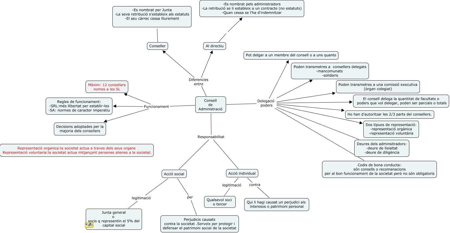 Este Cmap, tiene información relacionada con: C-map nº 9 Quin desgavell, Consell de Administració Diferencies entre Conseller, Consell de Administració Delegació poders Dos tipues de representació: -representació orgànica -representació voluntària, Consell de Administració Delegació poders Poden transmetres a consellers delegats -mancomunats -solidaris, Consell de Administració Delegació poders Deures dels adminsitradors: -deure de lleialtat -deure de diligència, Consell de Administració Responsabilitat Acció social, Consell de Administració Delegació poders El consell delega la quantitat de facultats o poders que vol delegar, poden ser parcials o totals, Consell de Administració Funcionament Regles de funcionament: -SRL:més llibertat per establir-les -SA: normes de caracter imperatiu, Al directiu -Es nombrat pels administradors -La retribució se li estableix a un contracte (no estatuts) -Quan cessa se l'ha d'indemnitzar, Consell de Administració Delegació poders Pot delgar a un membre del consell o a uns quants, Acció individual legitimació Qualsevol soci o tercer, Consell de Administració Delegació poders Poden transmetres a una comissió executiva (òrgan colegiat), Acció social per Perjudicis causats contra la societat .Serveix per protegir i defensar el patrimoni social de la societat, Consell de Administració Diferencies entre Al directiu, Acció social legitimació Junta general o socis q representin el 5% del capital social, Consell de Administració Funcionament Máxim: 12 consellers nomes a les SL, Conseller -Es nombrat per Junta -La seva retribució s'estableix als estatuts -El seu càrrec cessa lliurement, Consell de Administració Delegació poders Ho han d'autoritzar les 2/3 parts del consellers., Consell de Administració Delegació poders Codis de bona conducta: són consells o recomanacions per al bon funcionament de la societat però no són obligatoris, Consell de Administració Responsabilitat Acció individual, Acció individual contra Qui li hagi causat un perjudici als interesos o patrimoni personal