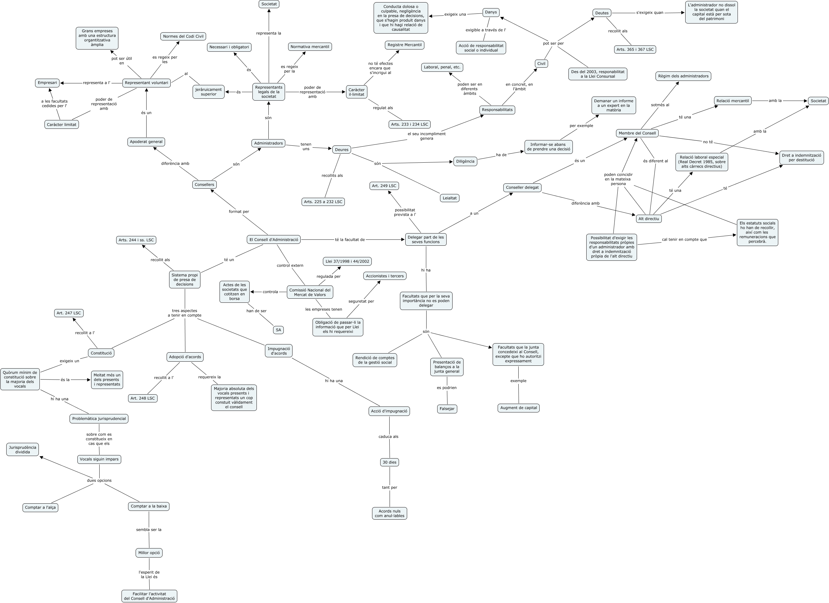 Este Cmap, tiene información relacionada con: Escenari 9 Quin desgavell!, Problemàtica jurisprudencial sobre com es constitueix en cas que els Vocals siguin impars, Conseller delegat és un Membre del Consell, Administradors són Representants legals de la societat, Civil pot ser per Danys, Alt directiu poden coincidir en la mateixa persona Membre del Consell, El Consell d'Administració control extern Comissió Nacional del Mercat de Valors, Alt directiu poden coincidir en la mateixa persona Els estatuts socials ho han de recollir, així com les remuneracions que percebrà., Comptar a la baixa sembla ser la Millor opció, El Consell d'Administració té la facultat de Delegar part de les seves funcions, Vocals siguin impars dues opcions Comptar a l'alça, Comissió Nacional del Mercat de Valors controla Actes de les societats que cotitzen en borsa, El Consell d'Administració format per Consellers, Informar-se abans de prendre una decisió per exemple Demanar un informe a un expert en la matèria, El Consell d'Administració té un Sistema propi de presa de decisions, Comissió Nacional del Mercat de Valors regulada per Llei 37/1998 i 44/2002, Adopció d'acords recollit a l' Art. 248 LSC, Facultats que per la seva importància no es poden delegar són Rendició de comptes de la gestió social, Adopció d'acords requereix la Majoria absoluta dels vocals presents i representats un cop constuit vàlidament el consell, Representant voluntari representa a l' Empresari, Sistema propi de presa de decisions tres aspectes a tenir en compte Impugnació d'acords