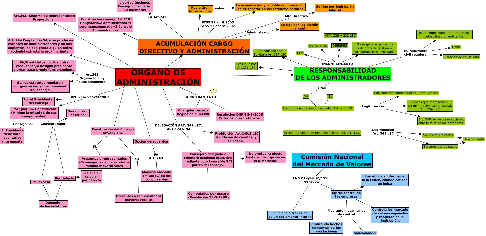 Este Cmap, tiene información relacionada con: 9.-Quin Desgavell, ORGANO DE ADMINISTRACIÓN ???? Art.243.-Sistema de Representación Proporcional., ACUMULACIÓN CARGO DIRECTIVO Y ADMINISTRACIÓN ???? Constitución consejo Art.210 Obligatorio.2 Administradores sera mancomunada+2 Consejo Administración., Ejerce control de las empresas ???? Controla los mercado de valores españoles y cooperan en la legislación., ORGANO DE ADMINISTRACIÓN ???? Art. 244 Cooptación.SA,si se producen vacantes de administradores y no hay suplentes, se designara alguien entre accionistas,hasta la proxima junta., Por defecto ???? Se suele calcular por defecto, Regla Gral. No se admite salvo La acumulación y la doble remuneración ha de constar en los estatutos sociales, ACUMULACIÓN CARGO DIRECTIVO Y ADMINISTRACIÓN ???? Regla Gral. No se admite, SL ???? Acción individual de Responsabilidad Art. 241 LSC, ORGANO DE ADMINISTRACIÓN APODERAMIENTO Cualquier tercero Reglas en el C.Civil, RESPONSABILIDAD DE LOS ADMINISTRADORES TIPOS SL, Por Quorum. Constitución (Minimo la mitad+1 de sus componentes) Consejo Impar Por exceso, RESPONSABILIDAD DE LOS ADMINISTRADORES Su naturaleza civil requiere; Daño, Opción de acuerdos SA Art. 248 Mayoria absoluta (mitad+1)de los concurrentes, Acción Social de Responsabilidad Art. 238 LSC Legitimación Art. 240. Acreedores sociales, ante la falta de los anteriores., ORGANO DE ADMINISTRACIÓN Art.245 Organización y Funcionamiento SA,Si estatutos no dicen otra cosa, consejo designa presidente y organizasu propio funcionamiento, ORGANO DE ADMINISTRACIÓN Art. 246.-Convocatoria Por el Presidente del consejo, ACUMULACIÓN CARGO DIRECTIVO Y ADMINISTRACIÓN STSS 21 abril 2005 STSS 12 enero 2007 La acumulación y la doble remuneración ha de constar en los estatutos sociales, Acción individual de Responsabilidad Art. 241 LSC Legitimación Art. 241 LSC Socios Perjudicados, Por Quorum. Constitución (Minimo la mitad+1 de sus componentes) Consejo Impar Por defecto, ORGANO DE ADMINISTRACIÓN DELEGACIÓN ART. 249 LSC; ART.124 RRM Consejero delegado o Miembro comisión Ejecutiva mediante voto favorable 2/3 partes del consejo.
