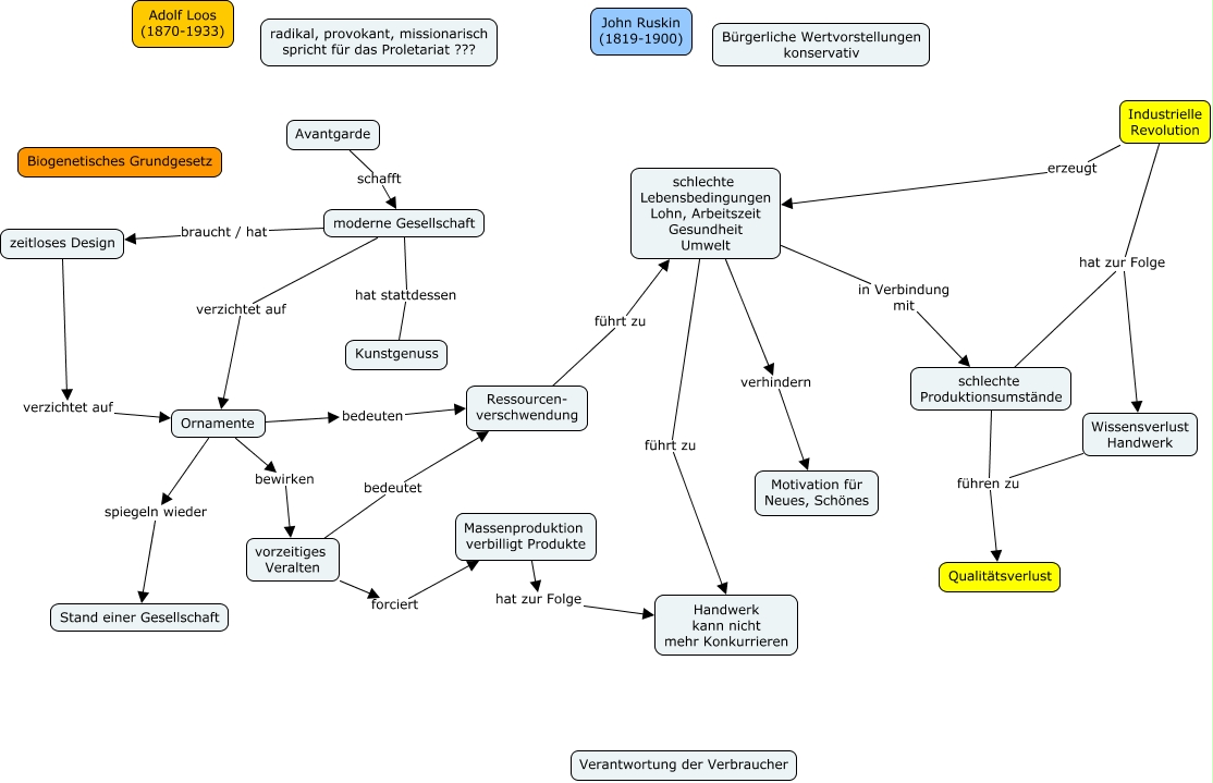 Dieses mit IHMC CmapTools erstellte CMap hat Informationen bezüglich: Ruskin_Loos, moderne Gesellschaft verzichtet auf Ornamente, schlechte Produktionsumstände führen zu Qualitätsverlust, moderne Gesellschaft braucht / hat zeitloses Design, Industrielle Revolution hat zur Folge schlechte Produktionsumstände, Massenproduktion verbilligt Produkte hat zur Folge Handwerk kann nicht mehr Konkurrieren, Industrielle Revolution erzeugt schlechte Lebensbedingungen Lohn, Arbeitszeit Gesundheit Umwelt, Ornamente bewirken vorzeitiges Veralten, Ressourcen- verschwendung führt zu schlechte Lebensbedingungen Lohn, Arbeitszeit Gesundheit Umwelt, schlechte Lebensbedingungen Lohn, Arbeitszeit Gesundheit Umwelt verhindern Motivation für Neues, Schönes, schlechte Lebensbedingungen Lohn, Arbeitszeit Gesundheit Umwelt führt zu Handwerk kann nicht mehr Konkurrieren, schlechte Lebensbedingungen Lohn, Arbeitszeit Gesundheit Umwelt in Verbindung mit schlechte Produktionsumstände, Avantgarde schafft moderne Gesellschaft, vorzeitiges Veralten forciert Massenproduktion verbilligt Produkte, moderne Gesellschaft hat stattdessen Kunstgenuss, Industrielle Revolution hat zur Folge Wissensverlust Handwerk, Ornamente spiegeln wieder Stand einer Gesellschaft, Wissensverlust Handwerk führen zu Qualitätsverlust, Ornamente bedeuten Ressourcen- verschwendung, vorzeitiges Veralten bedeutet Ressourcen- verschwendung, zeitloses Design verzichtet auf Ornamente