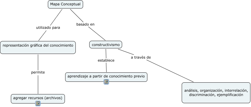 Este Cmap, tiene información relacionada con: definición mapa conceptual, Mapa Conceptual utilizado para representación gráfica del conocimiento, Mapa Conceptual basado en constructivismo, constructivismo a travès de análisis, organización, interrelación, discriminación, ejemplificación, constructivismo establece aprendizaje a partir de conocimiento previo, representación gráfica del conocimiento permite agregar recursos (archivos)