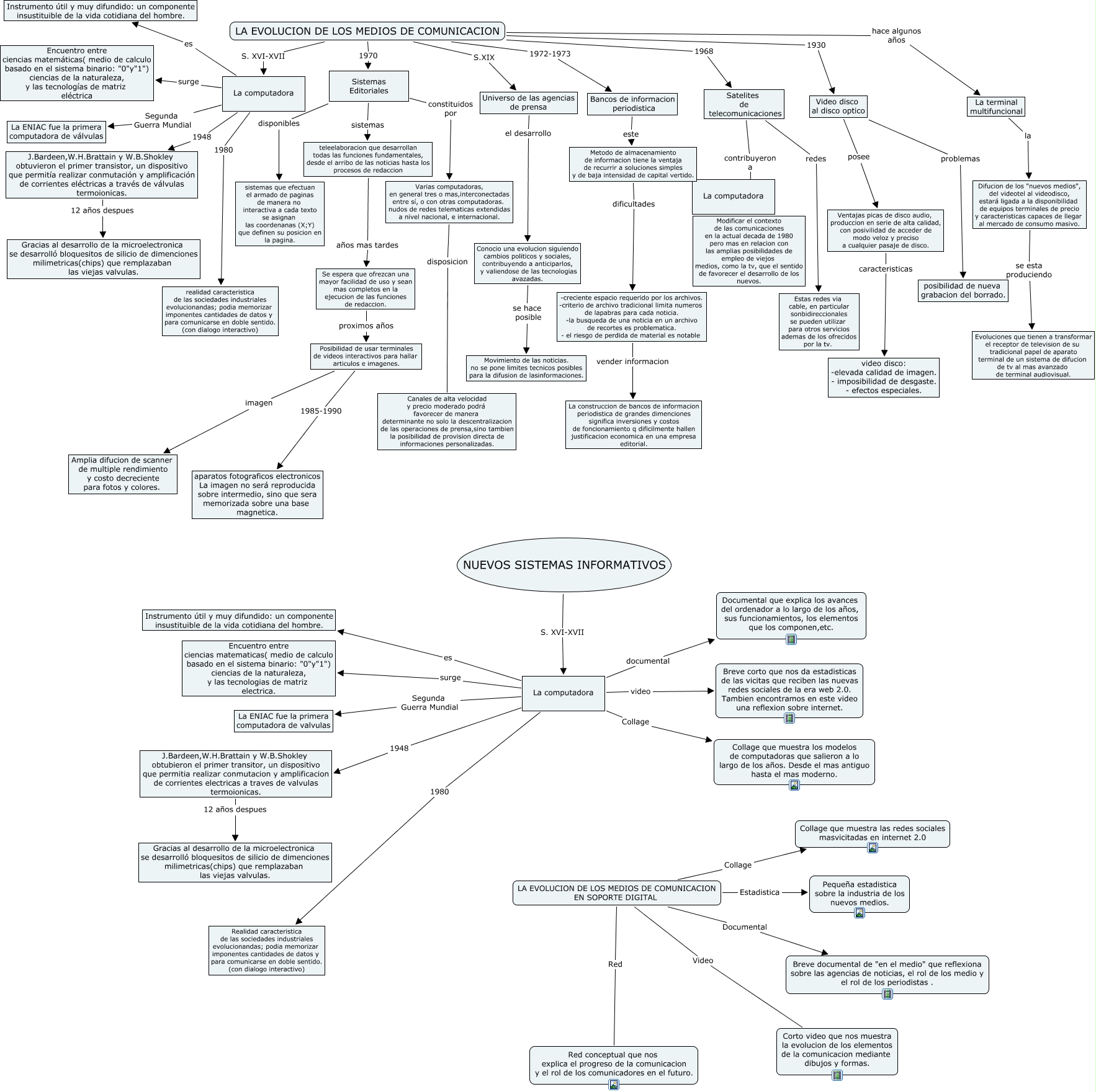 Este Cmap, tiene información relacionada con: Usos tecnologicos.cmap, La computadora Segunda Guerra Mundial La ENIAC fue la primera computadora de valvulas, -creciente espacio requerido por los archivos. -criterio de archivo tradicional limita numeros de lapabras para cada noticia. -la busqueda de una noticia en un archivo de recortes es problematica. - el riesgo de perdida de material es notable vender informacion La construccion de bancos de informacion periodistica de grandes dimenciones significa inversiones y costos de foncionamiento q dificilmente hallen justificacion economica en una empresa editorial., Sistemas Editoriales disponibles sistemas que efectuan el armado de paginas de manera no interactiva a cada texto se asignan las coordenanas (X;Y) que definen su posicion en la pagina., Satelites de telecomunicaciones redes Estas redes via cable, en particular sonbidireccionales se pueden utilizar para otros servicios ademas de los ofrecidos por la tv., Metodo de almacenamiento de informacion tiene la ventaja de recurrir a soluciones simples y de baja intensidad de capital vertido. dificultades -creciente espacio requerido por los archivos. -criterio de archivo tradicional limita numeros de lapabras para cada noticia. -la busqueda de una noticia en un archivo de recortes es problematica. - el riesgo de perdida de material es notable, LA EVOLUCION DE LOS MEDIOS DE COMUNICACION 1968 Satelites de telecomunicaciones, NUEVOS SISTEMAS INFORMATIVOS S. XVI-XVII La computadora, La terminal multifuncional la Difucion de los "nuevos medios", del videotel al videodisco, estará ligada a la disponibilidad de equipos terminales de precio y caracteristicas capaces de llegar al mercado de consumo masivo., LA EVOLUCION DE LOS MEDIOS DE COMUNICACION S.XIX Universo de las agencias de prensa, Ventajas picas de disco audio, produccion en serie de alta calidad, con posivilidad de acceder de modo veloz y preciso a cualquier pasaje de disco. caracteristicas video disco: -elevada calidad de imagen. - imposibilidad de desgaste. - efectos especiales., Sistemas Editoriales sistemas teleelaboracion que desarrollan todas las funciones fundamentales, desde el arribo de las noticias hasta los procesos de redaccion, LA EVOLUCION DE LOS MEDIOS DE COMUNICACION EN SOPORTE DIGITAL Estadistica Pequeña estadistica sobre la industria de los nuevos medios., J.Bardeen,W.H.Brattain y W.B.Shokley obtuvieron el primer transistor, un dispositivo que permitía realizar conmutación y amplificación de corrientes eléctricas a través de válvulas termoionicas. 12 años despues Gracias al desarrollo de la microelectronica se desarrolló bloquesitos de silicio de dimenciones milimetricas(chips) que remplazaban las viejas valvulas., La computadora 1948 J.Bardeen,W.H.Brattain y W.B.Shokley obtubieron el primer transitor, un dispositivo que permitia realizar conmutacion y amplificacion de corrientes electricas a traves de valvulas termoionicas., La computadora surge Encuentro entre ciencias matematicas( medio de calculo basado en el sistema binario: "0"y"1") ciencias de la naturaleza, y las tecnologias de matriz electrica., Se espera que ofrezcan una mayor facilidad de uso y sean mas completos en la ejecucion de las funciones de redaccion. proximos años Posibilidad de usar terminales de videos interactivos para hallar articulos e imagenes., La computadora Segunda Guerra Mundial La ENIAC fue la primera computadora de válvulas, LA EVOLUCION DE LOS MEDIOS DE COMUNICACION EN SOPORTE DIGITAL Red Red conceptual que nos explica el progreso de la comunicacion y el rol de los comunicadores en el futuro., LA EVOLUCION DE LOS MEDIOS DE COMUNICACION hace algunos años La terminal multifuncional, Bancos de informacion periodistica este Metodo de almacenamiento de informacion tiene la ventaja de recurrir a soluciones simples y de baja intensidad de capital vertido.