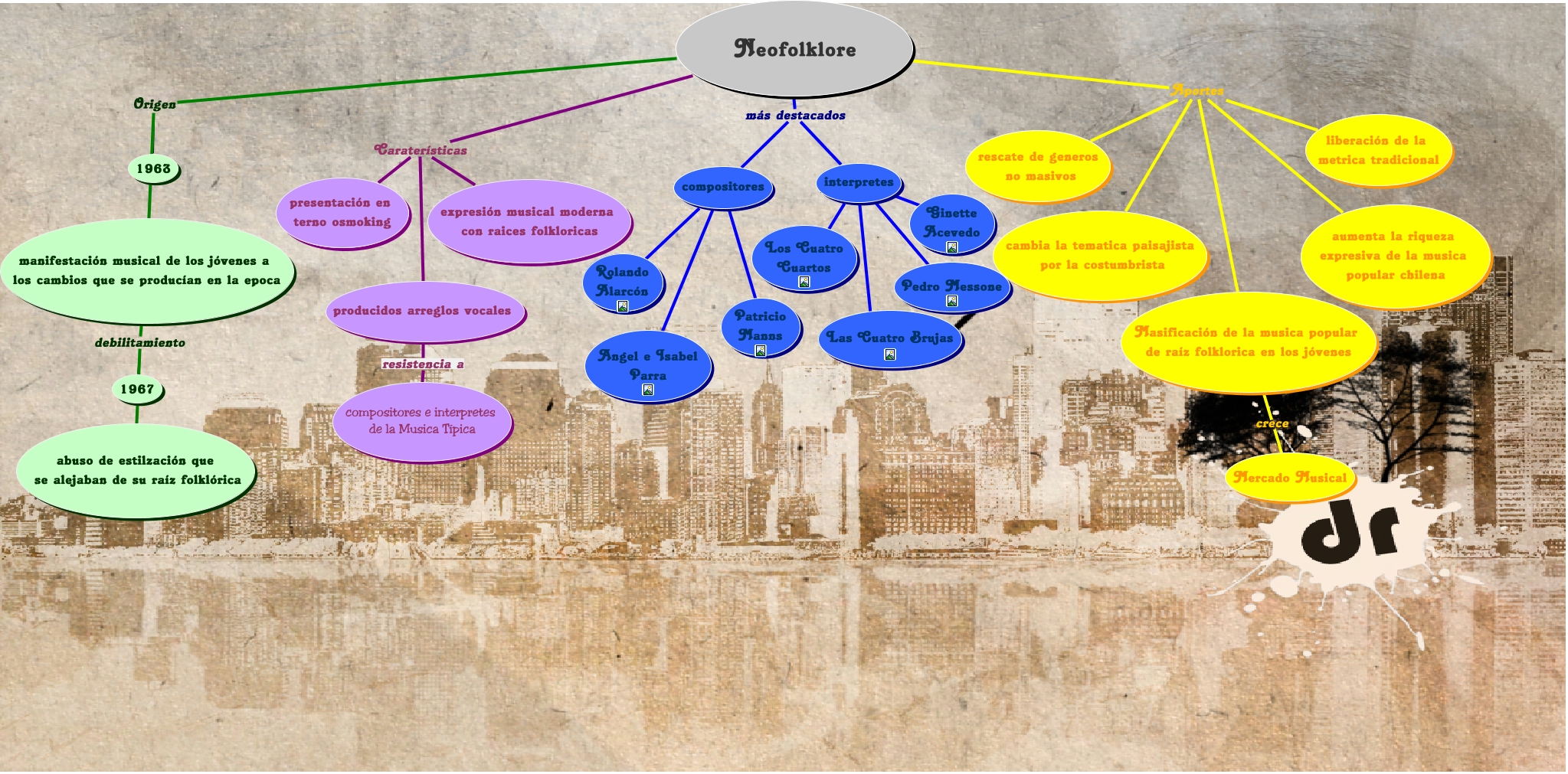 Este Cmap, tiene información relacionada con: Neofoklore, Neofolklore más destacados interpretes, Masificación de la musica popular de raíz folklorica en los jóvenes crece Mercado Musical, Neofolklore Aportes aumenta la riqueza expresiva de la musica popular chilena, compositores ???? Rolando Alarcón, interpretes ???? Los Cuatro Cuartos, Neofolklore Caraterísticas presentación en terno osmoking, Neofolklore Aportes liberación de la metrica tradicional, Neofolklore Caraterísticas producidos arreglos vocales, compositores ???? Angel e Isabel Parra, interpretes ???? Las Cuatro Brujas, manifestación musical de los jóvenes a los cambios que se producían en la epoca debilitamiento abuso de estilzación que se alejaban de su raíz folklórica, Neofolklore Aportes rescate de generos no masivos, Neofolklore más destacados compositores, interpretes ???? Pedro Messone, Neofolklore Aportes Masificación de la musica popular de raíz folklorica en los jóvenes, producidos arreglos vocales resistencia a compositores e interpretes de la Musica Típica, manifestación musical de los jóvenes a los cambios que se producían en la epoca debilitamiento 1967, interpretes ???? Ginette Acevedo, Neofolklore Origen manifestación musical de los jóvenes a los cambios que se producían en la epoca, compositores ???? Patricio Manns