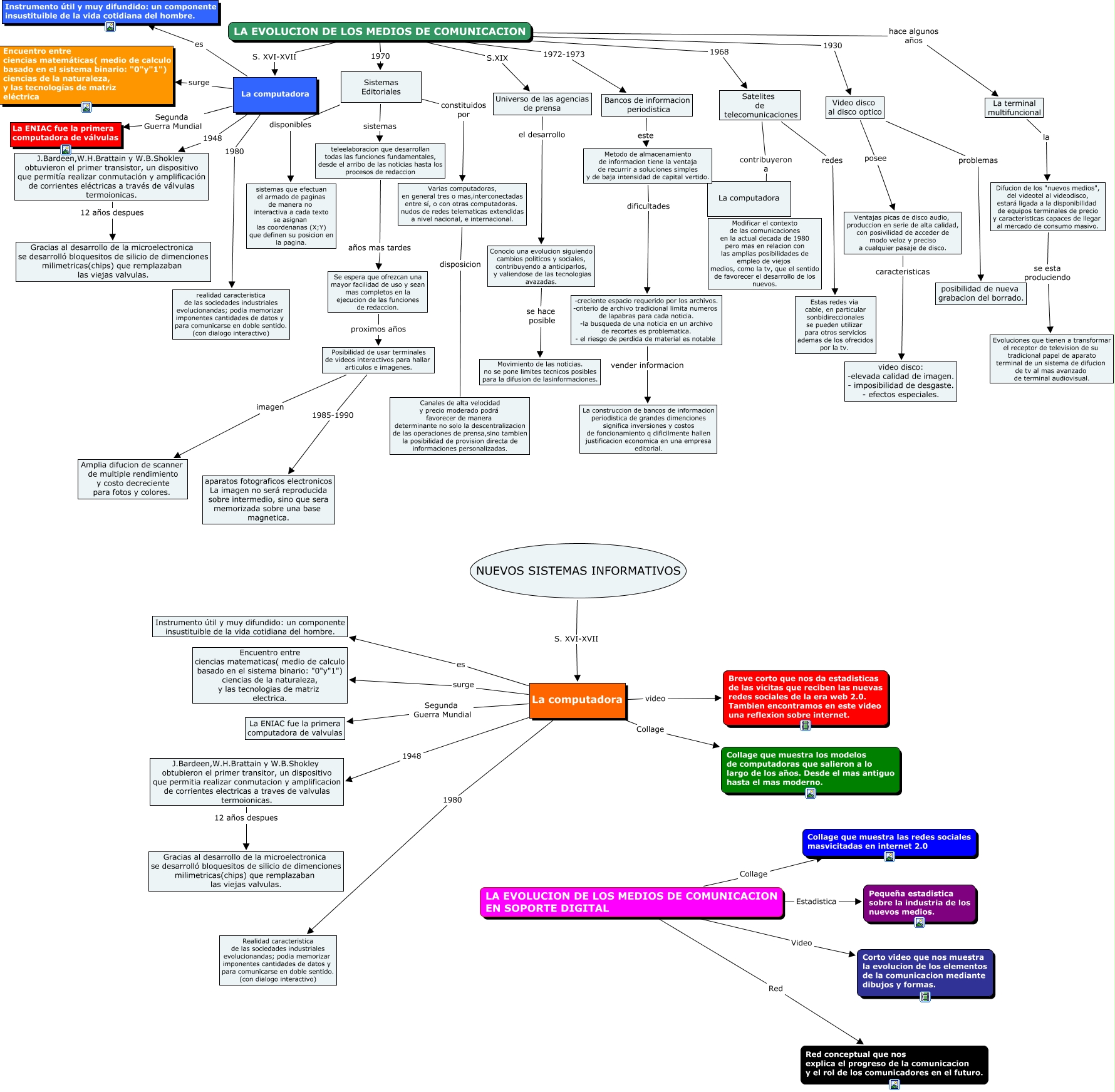 Este Cmap, tiene información relacionada con: Usos tecnologicos.cmap, Sistemas Editoriales disponibles sistemas que efectuan el armado de paginas de manera no interactiva a cada texto se asignan las coordenanas (X;Y) que definen su posicion en la pagina., -creciente espacio requerido por los archivos. -criterio de archivo tradicional limita numeros de lapabras para cada noticia. -la busqueda de una noticia en un archivo de recortes es problematica. - el riesgo de perdida de material es notable vender informacion La construccion de bancos de informacion periodistica de grandes dimenciones significa inversiones y costos de foncionamiento q dificilmente hallen justificacion economica en una empresa editorial., La computadora Segunda Guerra Mundial La ENIAC fue la primera computadora de valvulas, Satelites de telecomunicaciones redes Estas redes via cable, en particular sonbidireccionales se pueden utilizar para otros servicios ademas de los ofrecidos por la tv., NUEVOS SISTEMAS INFORMATIVOS S. XVI-XVII La computadora, LA EVOLUCION DE LOS MEDIOS DE COMUNICACION 1968 Satelites de telecomunicaciones, Metodo de almacenamiento de informacion tiene la ventaja de recurrir a soluciones simples y de baja intensidad de capital vertido. dificultades -creciente espacio requerido por los archivos. -criterio de archivo tradicional limita numeros de lapabras para cada noticia. -la busqueda de una noticia en un archivo de recortes es problematica. - el riesgo de perdida de material es notable, Ventajas picas de disco audio, produccion en serie de alta calidad, con posivilidad de acceder de modo veloz y preciso a cualquier pasaje de disco. caracteristicas video disco: -elevada calidad de imagen. - imposibilidad de desgaste. - efectos especiales., LA EVOLUCION DE LOS MEDIOS DE COMUNICACION S.XIX Universo de las agencias de prensa, La terminal multifuncional la Difucion de los "nuevos medios", del videotel al videodisco, estará ligada a la disponibilidad de equipos terminales de precio y caracteristicas capaces de llegar al mercado de consumo masivo., LA EVOLUCION DE LOS MEDIOS DE COMUNICACION EN SOPORTE DIGITAL Estadistica Pequeña estadistica sobre la industria de los nuevos medios., Sistemas Editoriales sistemas teleelaboracion que desarrollan todas las funciones fundamentales, desde el arribo de las noticias hasta los procesos de redaccion, La computadora 1948 J.Bardeen,W.H.Brattain y W.B.Shokley obtubieron el primer transitor, un dispositivo que permitia realizar conmutacion y amplificacion de corrientes electricas a traves de valvulas termoionicas., J.Bardeen,W.H.Brattain y W.B.Shokley obtuvieron el primer transistor, un dispositivo que permitía realizar conmutación y amplificación de corrientes eléctricas a través de válvulas termoionicas. 12 años despues Gracias al desarrollo de la microelectronica se desarrolló bloquesitos de silicio de dimenciones milimetricas(chips) que remplazaban las viejas valvulas., La computadora surge Encuentro entre ciencias matematicas( medio de calculo basado en el sistema binario: "0"y"1") ciencias de la naturaleza, y las tecnologias de matriz electrica., LA EVOLUCION DE LOS MEDIOS DE COMUNICACION EN SOPORTE DIGITAL Red Red conceptual que nos explica el progreso de la comunicacion y el rol de los comunicadores en el futuro., La computadora Segunda Guerra Mundial La ENIAC fue la primera computadora de válvulas, Se espera que ofrezcan una mayor facilidad de uso y sean mas completos en la ejecucion de las funciones de redaccion. proximos años Posibilidad de usar terminales de videos interactivos para hallar articulos e imagenes., LA EVOLUCION DE LOS MEDIOS DE COMUNICACION hace algunos años La terminal multifuncional, La computadora es Instrumento útil y muy difundido: un componente insustituible de la vida cotidiana del hombre.