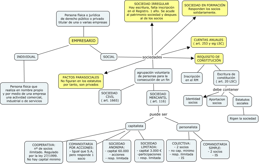 Este Cmap, tiene información relacionada con: Escenario 1 bueno, EMPRESARIO ???? INDIVIDUAL, SOCIEDAD MERCANTIL ( art. 116) puede ser personalista, agrupación voluntaria de personas para la consecución de un fin ???? SOCIEDAD CIVIL ( art. 1665), SOCIAL sociedades SOCIEDAD IRREGULAR Hay escritura, falta inscripción en el Registro. 1 año. Se acude al patrimonio sociedad y despues al de los socios, REQUISITO DE CONSTITUCIÓN ???? Escritura de constitución ( art. 20 LSC), SOCIAL sociedades agrupación voluntaria de personas para la consecución de un fin, agrupación voluntaria de personas para la consecución de un fin ???? SOCIEDAD MERCANTIL ( art. 116), capitalista ???? COOPERATIVA: nº de socios ilimitado. Regulado por la ley 27/1999. No hay capital minimo, SOCIEDAD MERCANTIL ( art. 116) puede ser capitalista, Escritura de constitución ( art. 20 LSC) debe contener Identidad socios, Estatutos sociales ???? Rigen la sociedad, personalista ???? COLECTIVA: - 2 socios - no cap. minimo - resp. ilimitada - IS, capitalista ???? COMANDITARIA POR ACCIONES: - Igual que S.A, pero responde 1 socio, SOCIAL sociedades SOCIEDAD EN FORMACIÓN Responden los socios solidariamente., REQUISITO DE CONSTITUCIÓN ???? Inscripción en el RM, Escritura de constitución ( art. 20 LSC) debe contener Estatutos sociales, INDIVIDUAL ???? Persona física que realiza en nombre propio y por medio de una empresa una actividad comercial, industrial o de servicios, SOCIAL sociedades REQUISITO DE CONSTITUCIÓN, capitalista ???? SOCIEDAD LIMITADA: - capital 3.000 € -participaciones - resp. limitada, SOCIAL sociedades PACTOS PARASOCIALES No figuran en los estatutos por tanto, son privados