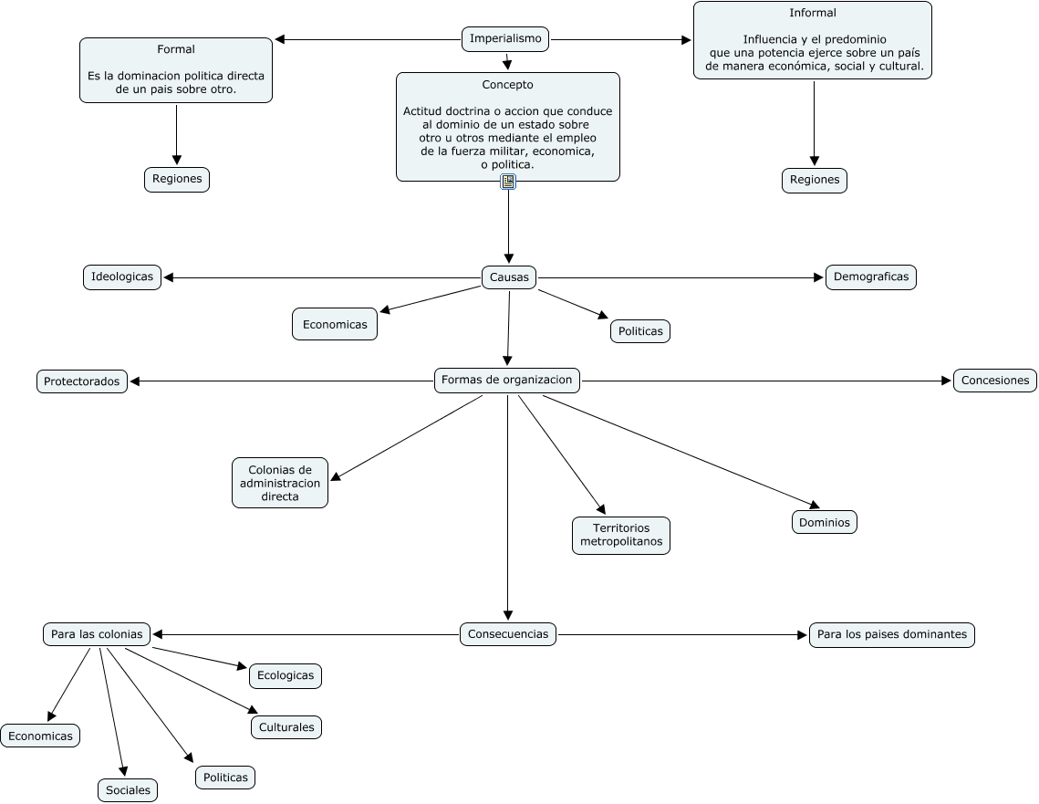 Este Cmap, tiene información relacionada con: historia bosco (1), Causas Ideologicas, Formas de organizacion Dominios, Para las colonias Sociales, Para las colonias Culturales, Causas Formas de organizacion, Para las colonias Economicas, Formas de organizacion Protectorados, Formas de organizacion Consecuencias, Formas de organizacion Territorios metropolitanos, Para las colonias Ecologicas, Causas Politicas, Consecuencias Para las colonias, Concepto Actitud doctrina o accion que conduce al dominio de un estado sobre otro u otros mediante el empleo de la fuerza militar, economica, o politica. Causas, Consecuencias Para los paises dominantes, Formas de organizacion Concesiones, Imperialismo Informal Influencia y el predominio que una potencia ejerce sobre un país de manera económica, social y cultural., Imperialismo Formal Es la dominacion politica directa de un pais sobre otro., Formas de organizacion Colonias de administracion directa, Causas Economicas, Informal Influencia y el predominio que una potencia ejerce sobre un país de manera económica, social y cultural. Regiones
