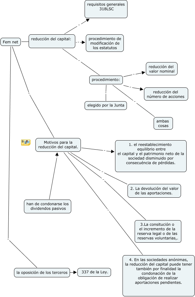 Este Cmap, tiene información relacionada con: caso 10, han de condonarse los dividendos pasivos . Motivos para la reducción del capital., Motivos para la reducción del capital. . 4. En las sociedades anónimas, la reducción del capital puede tener también por finalidad la condonación de la obligación de realizar aportaciones pendientes., Fem net . Motivos para la reducción del capital., reducción del capital: . procedimiento:, reducción del capital: . procedimiento de modificación de los estatutos, Motivos para la reducción del capital. . 3.La consitución o el incremento de la reserva legal o de las reservas voluntarias,., Fem net . reducción del capital:, la oposición de los terceros . 337 de la Ley., Fem net . la oposición de los terceros, procedimiento: . elegido por la Junta, Motivos para la reducción del capital. . 1. el reestablecimiento equilibrio entre el capital y el patrimonio neto de la sociedad disminuido por consecuéncia de pérdidas., procedimiento: . reducción del valor nominal, Motivos para la reducción del capital. . 2. La devolución del valor de las aportaciones., procedimiento: . reducción del número de acciones, reducción del capital: . requisitos generales 318LSC, procedimiento: . ambas cosas