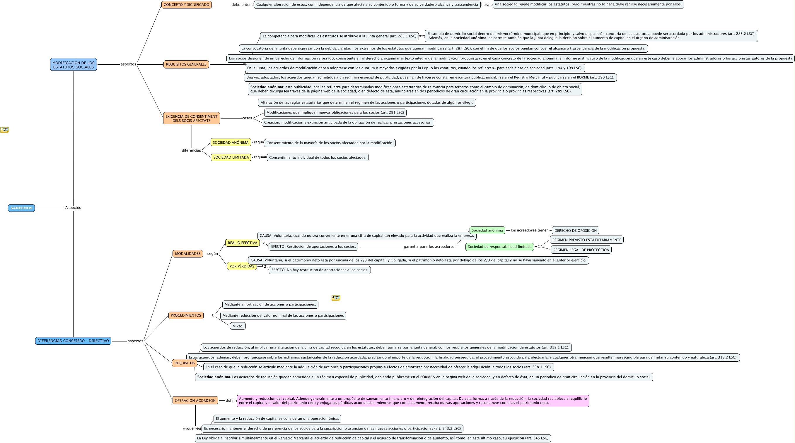 Este Cmap, tiene información relacionada con: Mapa Conceptual nº 10, EXIGÈNCIA DE CONSENTIMENT DELS SOCIS AFECTATS casos Modificaciones que impliquen nuevas obligaciones para los socios (art. 291 LSC), OPERACIÓN ACORDEÓN características Es necesario mantener el derecho de preferencia de los socios para la suscripción o asunción de las nuevas acciones o participaciones (art. 343.2 LSC), MODALIDADES según POR PÉRDIDAS, POR PÉRDIDAS 2 EFECTO: No hay restitución de aportaciones a los socios., MODALIDADES según REAL O EFECTIVA, REQUISITOS GENERALES 6 Los socios disponen de un derecho de información reforzado, consistente en el derecho a examinar el texto íntegro de la modificación propuesta y, en el caso concreto de la sociedad anónima, el informe justificativo de la modificación que en este caso deben elaborar los administradores o los accionistas autores de la propuesta, POR PÉRDIDAS 2 CAUSA: Voluntaria, si el patrimonio neto esta por encima de los 2/3 del capital; y Obligada, si el patrimonio neto esta por debajo de los 2/3 del capital y no se haya saneado en el anterior ejercicio., REQUISITOS GENERALES 6 Una vez adoptados, los acuerdos quedan sometidos a un régimen especial de publicidad, pues han de hacerse constar en escritura pública, inscribirse en el Registro Mercantil y publicarse en el BORME (art. 290 LSC)., SANEEMOS Aspectos MODIFICACIÓN DE LOS ESTATUTOS SOCIALES, CONCEPTO Y SIGNIFICADO debe entenderse Cualquier alteración de éstos, con independencia de que afecte a su contenido o forma y de su verdadero alcance y trascendencia, MODIFICACIÓN DE LOS ESTATUTOS SOCIALES aspectos CONCEPTO Y SIGNIFICADO, OPERACIÓN ACORDEÓN características El aumento y la reducción de capital se consideran una operación única., PROCEDIMIENTOS 3 Mixto., REQUISITOS GENERALES 6 Sociedad anónima: esta publicidad legal se refuerza para determinadas modificaciones estatutarias de relevancia para terceros como el cambio de dominación, de domicilio, o de objeto social, que deben divulgarsea través de la página web de la sociedad, o en defecto de ésta, anunciarse en dos periódicos de gran circulación en la provincia o provincias respectivas (art. 289 LSC)., MODIFICACIÓN DE LOS ESTATUTOS SOCIALES aspectos REQUISITOS GENERALES, REQUISITOS según Estos acuerdos, además, deben pronunciarse sobre los extremos sustanciales de la reducción acordada, precisando el importe de la reducción, la finalidad perseguida, el procedimiento escogido para efectuarla, y cualquier otra mención que resulte imprescindible para delimitar su contenido y naturaleza (art. 318.2 LSC)., La competencia para modificar los estatutos se atribuye a la junta general (art. 285.1 LSC) Excepción El cambio de domicilio social dentro del mismo término municipal, que en principio, y salvo disposición contraria de los estatutos, puede ser acordada por los administradores (art. 285.2 LSC). Además, en la sociedad anónima, se permite también que la junta delegue la decisión sobre el aumento de capital en el órgano de administración., Sociedad de responsabilidad limitada 2 RÉGIMEN PREVISTO ESTATUTARIAMENTE, DIFERENCIAS CONSEJERO - DIRECTIVO aspectos REQUISITOS, Cualquier alteración de éstos, con independencia de que afecte a su contenido o forma y de su verdadero alcance y trascendencia ahora bien una sociedad puede modificar los estatutos, pero mientras no lo haga debe regirse necesariamente por ellos.