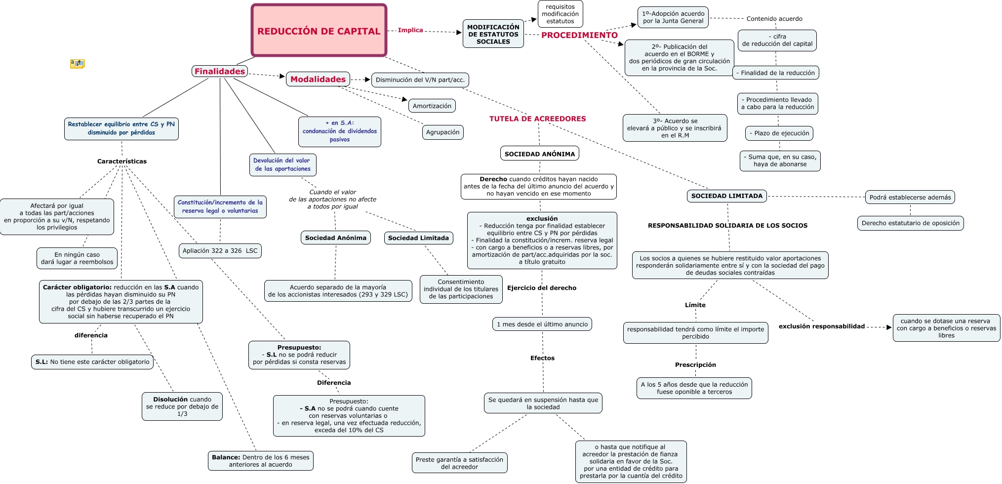 Aquest mapa conceptual conté informació relacionada amb: Escenario 10, Devolución del valor de las aportaciones Cuando el valor de las aportaciones no afecte a todos por igual Sociedad Limitada, Carácter obligatorio: reducción en las S.A cuando las pérdidas hayan disminuido su PN por debajo de las 2/3 partes de la cifra del CS y hubiere transcurrido un ejercicio social sin haberse recuperado el PN diferencia S.L: No tiene este carácter obligatorio, - Procedimiento llevado a cabo para la reducción ???? - Plazo de ejecución, exclusión - Reducción tenga por finalidad establecer equilibrio entre CS y PN por pérdidas - Finalidad la constitución/increm. reserva legal - con cargo a beneficios o a reservas libres, por amortización de part/acc.adquiridas por la soc. a título gratuito Ejercicio del derecho 1 mes desde el último anuncio, Carácter obligatorio: reducción en las S.A cuando las pérdidas hayan disminuido su PN por debajo de las 2/3 partes de la cifra del CS y hubiere transcurrido un ejercicio social sin haberse recuperado el PN ???? Disolución cuando se reduce por debajo de 1/3, SOCIEDAD ANÓNIMA Derecho cuando créditos hayan nacido antes de la fecha del último anuncio del acuerdo y no hayan vencido en ese momento exclusión - Reducción tenga por finalidad establecer equilibrio entre CS y PN por pérdidas - Finalidad la constitución/increm. reserva legal - con cargo a beneficios o a reservas libres, por amortización de part/acc.adquiridas por la soc. a título gratuito, REDUCCIÓN DE CAPITAL Finalidades + en S.A: condonación de dividendos pasivos, SOCIEDAD LIMITADA ???? Podrá establecerse además, Se quedará en suspensión hasta que la sociedad ???? o hasta que notifique al acreedor la prestación de fianza solidaria en favor de la Soc. por una entidad de crédito para prestarla por la cuantía del crédito, REDUCCIÓN DE CAPITAL Finalidades Devolución del valor de las aportaciones, 1 mes desde el último anuncio Efectos Se quedará en suspensión hasta que la sociedad, Se quedará en suspensión hasta que la sociedad ???? Preste garantía a satisfacción del acreedor, MODIFICACIÓN DE ESTATUTOS SOCIALES PROCEDIMIENTO 3º- Acuerdo se elevará a público y se inscribirá en el R.M, Constitución/incremento de la reserva legal o voluntarias ???? Apliación 322 a 326 LSC, REDUCCIÓN DE CAPITAL TUTELA DE ACREEDORES SOCIEDAD ANÓNIMA, Modalidades ???? Agrupación, MODIFICACIÓN DE ESTATUTOS SOCIALES PROCEDIMIENTO 2º- Publicación del acuerdo en el BORME y dos periódicos de gran circulación en la provincia de la Soc., Sociedad Limitada ???? Consentimiento individual de los titulares de las participaciones, Modalidades ???? Amortización, Restablecer equilibrio entre CS y PN disminuido por pérdidas Características Presupuesto: - S.L no se podrá reducir por pérdidas si consta reservas
