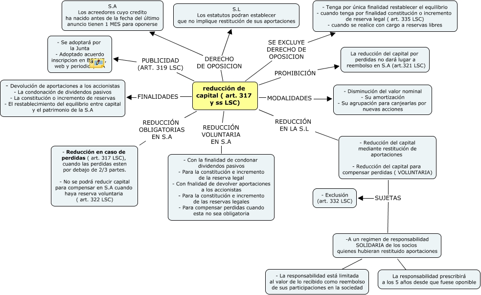 Aquest mapa conceptual conté informació relacionada amb: Escenario 10, reducción de capital ( art. 317 y ss LSC) FINALIDADES - Devolución de aportaciones a los accionistas - La condonación de dividendos pasivos - La constitución o incremento de reservas - El restablecimiento del equilibrio entre capital y el patrimonio de la S.A, -A un regimen de responsabilidad SOLIDARIA de los socios quienes hubieran restituido aportaciones ???? - La responsabilidad está limitada al valor de lo recibido como reembolso de sus participaciones en la sociedad, reducción de capital ( art. 317 y ss LSC) REDUCCIÓN EN LA S.L - Reducción del capital mediante restitución de aportaciones - Reducción del capital para compensar perdidas ( VOLUNTARIA), reducción de capital ( art. 317 y ss LSC) MODALIDADES - Disminución del valor nominal - Su amortización - Su agrupación para canjearlas por nuevas acciones, reducción de capital ( art. 317 y ss LSC) REDUCCIÓN VOLUNTARIA EN S.A - Con la finalidad de condonar dividendos pasivos - Para la constitución e incremento de la reserva legal - Con fnalidad de devolver aportaciones a los accionistas - Para la constitución e incremento de las reservas legales - Para compensar perdidas cuando esta no sea obligatoria, -A un regimen de responsabilidad SOLIDARIA de los socios quienes hubieran restituido aportaciones ???? La responsabilidad prescribirá a los 5 años desde que fuese oponible, - Reducción del capital mediante restitución de aportaciones - Reducción del capital para compensar perdidas ( VOLUNTARIA) SUJETAS -A un regimen de responsabilidad SOLIDARIA de los socios quienes hubieran restituido aportaciones, reducción de capital ( art. 317 y ss LSC) PUBLICIDAD (ART. 319 LSC) - Se adoptará por la Junta - Adoptado acuerdo inscripcion en BORME, web y periodico, S.A, reducción de capital ( art. 317 y ss LSC) REDUCCIÓN OBLIGATORIAS EN S.A - Reducción en caso de perdidas ( art. 317 LSC), cuando las perdidas esten por debajo de 2/3 partes. - No se podrá reducir capital para compensar en S.A cuando haya reserva voluntaria ( art. 322 LSC), reducción de capital ( art. 317 y ss LSC) DERECHO DE OPOSICION S.A Los acreedores cuyo credito ha nacido antes de la fecha del último anuncio tienen 1 MES para oponerse, reducción de capital ( art. 317 y ss LSC) PROHIBICIÓN La reducción del capital por perdidas no dará lugar a reembolso en S.A (art.321 LSC), reducción de capital ( art. 317 y ss LSC) SE EXCLUYE DERECHO DE OPOSICION - Tenga por única finalidad restablecer el equilibrio - cuando tenga por finalidad constitución o incremento de reserva legal ( art. 335 LSC) - cuando se realice con cargo a reservas libres, - Reducción del capital mediante restitución de aportaciones - Reducción del capital para compensar perdidas ( VOLUNTARIA) SUJETAS - Exclusión (art. 332 LSC), reducción de capital ( art. 317 y ss LSC) DERECHO DE OPOSICION S.L Los estatutos podran establecer que no implique restitución de sus aportaciones