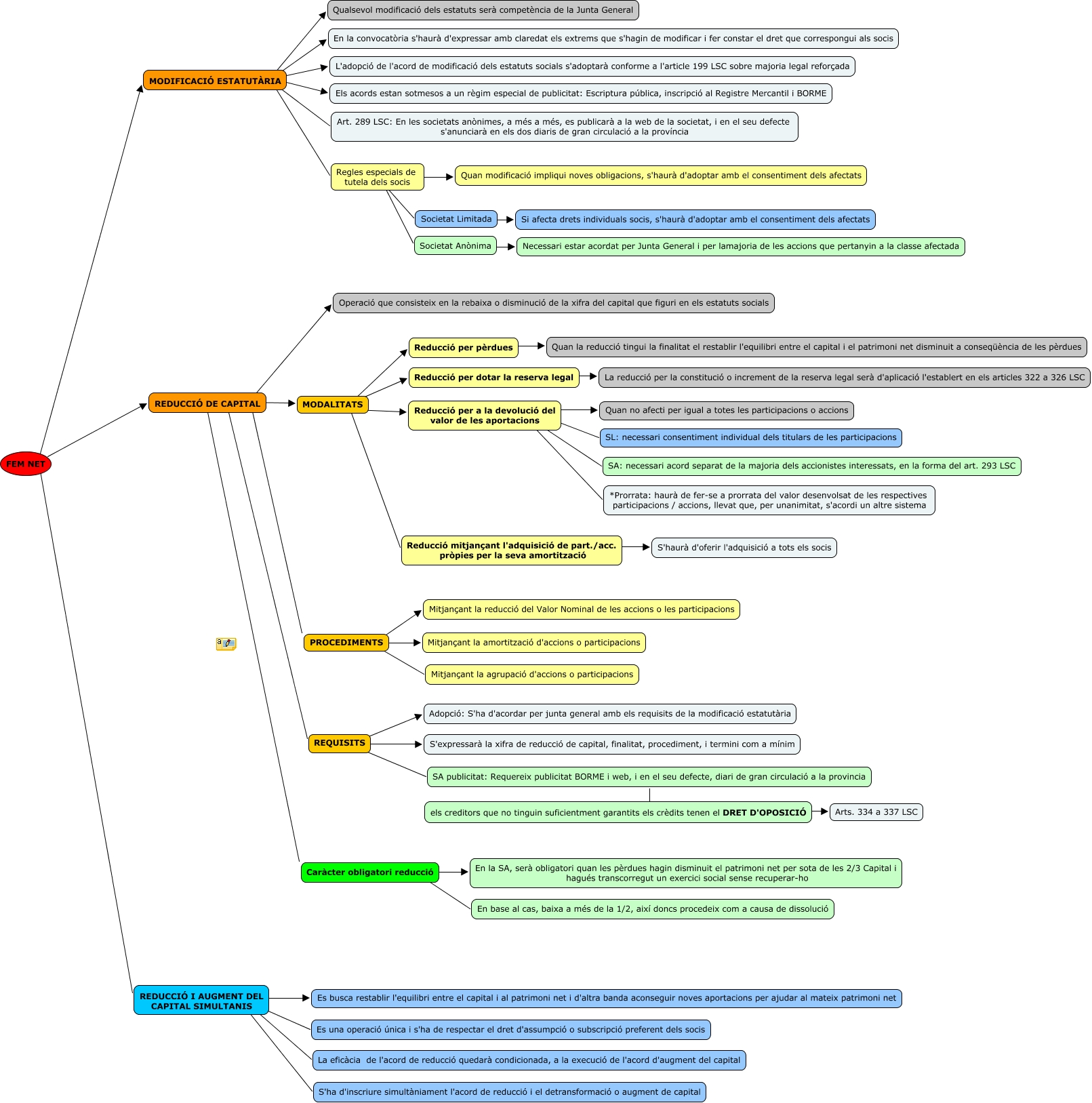 Este Cmap, tiene información relacionada con: Supòsit 10 - Fem net, PROCEDIMENTS ???? Mitjançant la amortització d'accions o participacions, REDUCCIÓ I AUGMENT DEL CAPITAL SIMULTANIS ???? Es una operació única i s'ha de respectar el dret d'assumpció o subscripció preferent dels socis, Reducció per pèrdues ???? Quan la reducció tingui la finalitat el restablir l'equilibri entre el capital i el patrimoni net disminuit a conseqüència de les pèrdues, REQUISITS ???? Adopció: S'ha d'acordar per junta general amb els requisits de la modificació estatutària, REQUISITS ???? SA publicitat: Requereix publicitat BORME i web, i en el seu defecte, diari de gran circulació a la provincia, MODALITATS ???? Reducció per pèrdues, REQUISITS ???? S'expressarà la xifra de reducció de capital, finalitat, procediment, i termini com a mínim, MODIFICACIÓ ESTATUTÀRIA ???? Art. 289 LSC: En les societats anònimes, a més a més, es publicarà a la web de la societat, i en el seu defecte s'anunciarà en els dos diaris de gran circulació a la província, REDUCCIÓ DE CAPITAL ???? Caràcter obligatori reducció, Reducció per a la devolució del valor de les aportacions ???? *Prorrata: haurà de fer-se a prorrata del valor desenvolsat de les respectives participacions / accions, llevat que, per unanimitat, s'acordi un altre sistema, Reducció per dotar la reserva legal ???? La reducció per la constitució o increment de la reserva legal serà d'aplicació l'establert en els articles 322 a 326 LSC, Societat Anònima ???? Necessari estar acordat per Junta General i per lamajoria de les accions que pertanyin a la classe afectada, Reducció per a la devolució del valor de les aportacions ???? SL: necessari consentiment individual dels titulars de les participacions, MODIFICACIÓ ESTATUTÀRIA ???? Qualsevol modificació dels estatuts serà competència de la Junta General, Caràcter obligatori reducció ???? En la SA, serà obligatori quan les pèrdues hagin disminuit el patrimoni net per sota de les 2/3 Capital i hagués transcorregut un exercici social sense recuperar-ho, REDUCCIÓ DE CAPITAL ???? MODALITATS, MODIFICACIÓ ESTATUTÀRIA ???? L'adopció de l'acord de modificació dels estatuts socials s'adoptarà conforme a l'article 199 LSC sobre majoria legal reforçada, REDUCCIÓ I AUGMENT DEL CAPITAL SIMULTANIS ???? S'ha d'inscriure simultàniament l'acord de reducció i el detransformació o augment de capital, MODIFICACIÓ ESTATUTÀRIA ???? Els acords estan sotmesos a un règim especial de publicitat: Escriptura pública, inscripció al Registre Mercantil i BORME, MODALITATS ???? Reducció per dotar la reserva legal