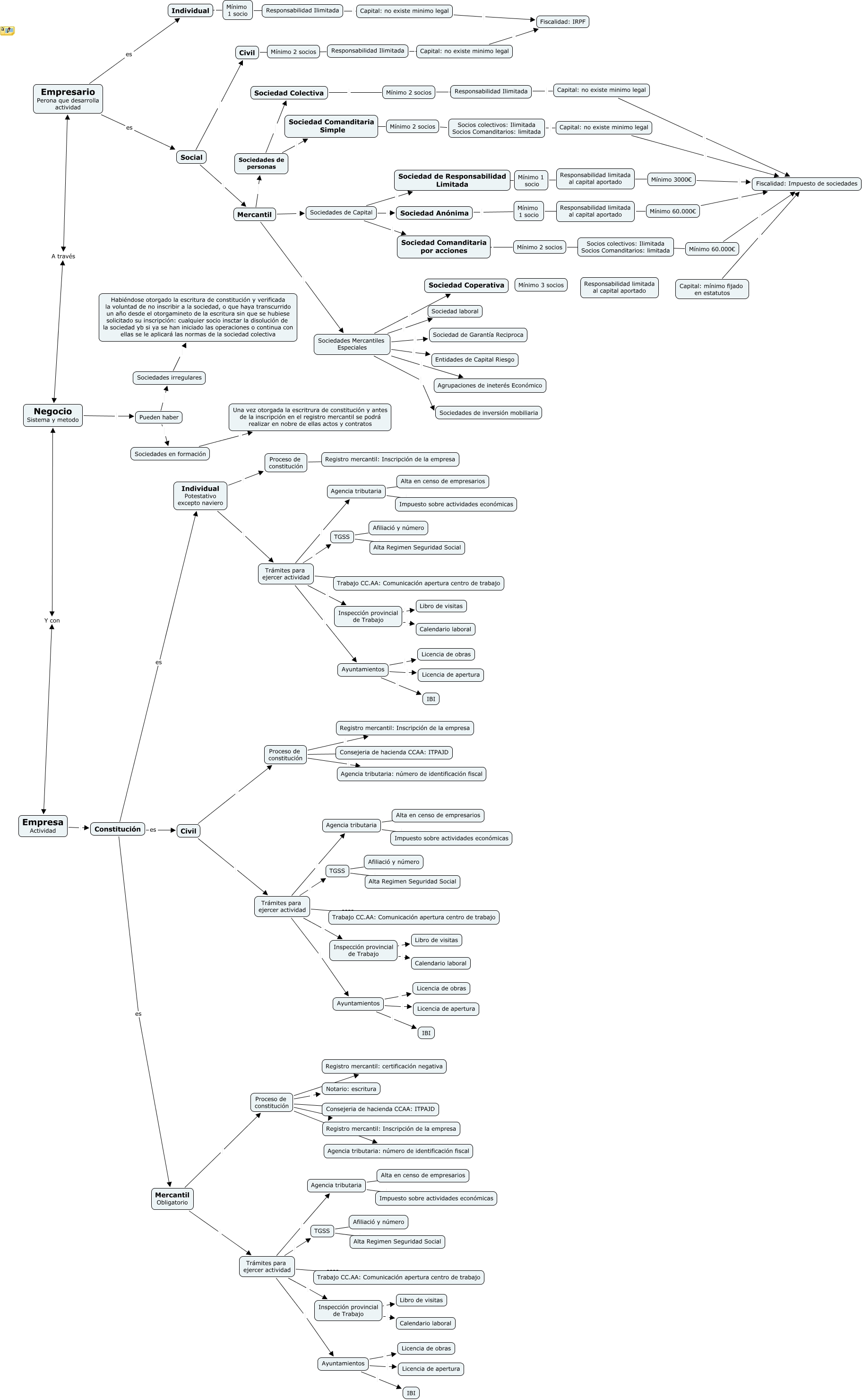 Este Cmap, tiene información relacionada con: Escenari1 un negoci familiar (revisado), Mínimo 60.000€ Fiscalidad: Impuesto de sociedades, Mínimo 2 socios ???? Socios colectivos: Ilimitada Socios Comanditarios: limitada, Agencia tributaria Impuesto sobre actividades económicas, Proceso de constitución Consejeria de hacienda CCAA: ITPAJD, Sociedades de personas Sociedad Colectiva, Sociedades en formación Una vez otorgada la escritrura de constitución y antes de la inscripción en el registro mercantil se podrá realizar en nobre de ellas actos y contratos, Trámites para ejercer actividad ???? Trabajo CC.AA: Comunicación apertura centro de trabajo, Mercantil Obligatorio Trámites para ejercer actividad, Trámites para ejercer actividad TGSS, Constitución es Individual Potestativo excepto naviero, Mínimo 1 socio Responsabilidad limitada al capital aportado, Responsabilidad Ilimitada Capital: no existe minimo legal, Inspección provincial de Trabajo Libro de visitas, Proceso de constitución Registro mercantil: certificación negativa, Agencia tributaria Alta en censo de empresarios, Sociedades Mercantiles Especiales Sociedad de Garantía Reciproca, Social Civil, Capital: no existe minimo legal Responsabilidad Ilimitada, Trámites para ejercer actividad Inspección provincial de Trabajo, Capital: no existe minimo legal Fiscalidad: Impuesto de sociedades