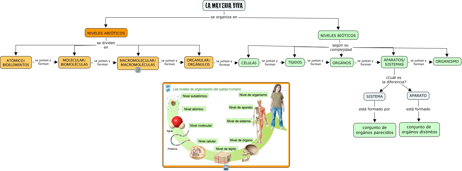 Este Cmap, tiene información relacionada con: 1. Los niveles de organización, NIVELES BIÓTICOS según su complejidad ORGANISMO, LA MATERIA VIVA se organiza en NIVELES ABIÓTICOS, CÉLULAS se juntan y forman TEJIDOS, NIVELES ABIÓTICOS se dividen en MACROMOLECULAR/ MACROMOLÉCULAS, NIVELES BIÓTICOS según su complejidad ORGÁNOS, ORGANULAR/ ORGÁNULOS se juntan y forman CÉLULAS, NIVELES ABIÓTICOS se dividen en ATÓMICO/ BIOELEMENTOS, SISTEMA está formado por conjunto de orgános parecidos, NIVELES BIÓTICOS según su complejidad CÉLULAS, APARATOS/ SISTEMAS se juntan y forman ORGANISMO, NIVELES ABIÓTICOS se dividen en MOLECULAR/ BIOMOLÉCULAS, TEJIDOS se juntan y forman ORGÁNOS, ORGÁNOS se juntan y forman APARATOS/ SISTEMAS, NIVELES BIÓTICOS según su complejidad TEJIDOS, APARATO está formado conjunto de orgános distintos, MACROMOLECULAR/ MACROMOLÉCULAS se juntan y forman ORGANULAR/ ORGÁNULOS, NIVELES ABIÓTICOS se dividen en ORGANULAR/ ORGÁNULOS, LA MATERIA VIVA se organiza en NIVELES BIÓTICOS, APARATOS/ SISTEMAS ¿Cuál es la diferencia? APARATO, APARATOS/ SISTEMAS ¿Cuál es la diferencia? SISTEMA