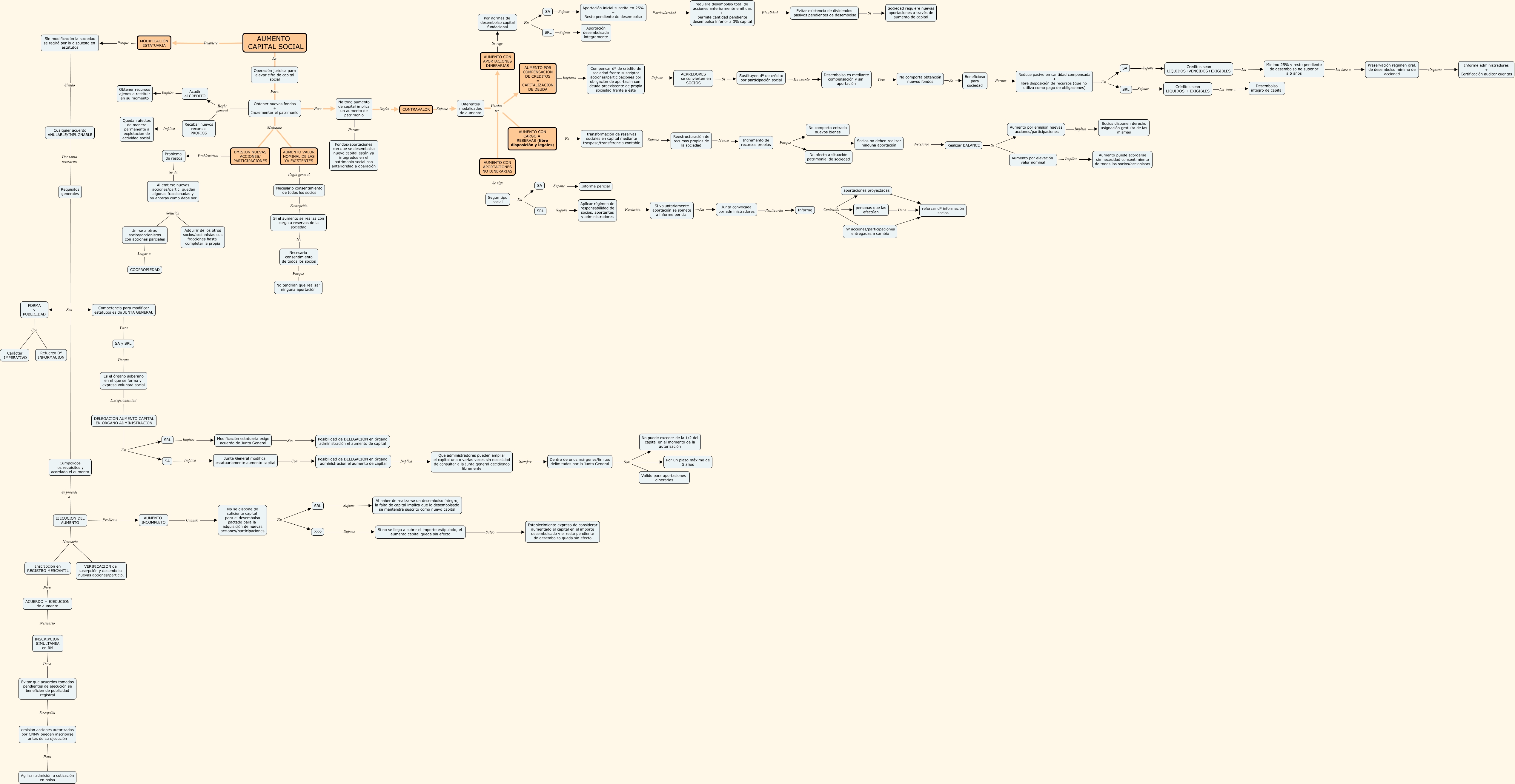 Este Cmap, tiene información relacionada con: CMAP PBL 8, Dentro de unos márgenes/límites delimitados por la Junta General Son No puede exceder de la 1/2 del capital en el momento de la autorización, Junta General modifica estatuariamente aumento capital Con Posibilidad de DELEGACION en órgano administración el aumento de capital, No comporta obtención nuevos fondos Es Beneficioso para sociedad, AUMENTO CON APORTACIONES DINERARIAS Se rige Por normas de desembolso capital fundacional, Cumpolidos los requisitos y acordado el aumento Se procede a EJECUCION DEL AUMENTO, Reduce pasivo en cantidad compensada + libre disposición de recursos (que no utiliza como pago de obligaciones) En SA, Al emtirse nuevas acciones/partic. quedan algunas fraccionadas y no enteras como debe ser Solución Adquirir de los otros socios/accionistas sus fracciones hasta completar la propia, ACUERDO + EJECUCION de aumento Nesesario INSCRIPCION SIMULTANEA en RM, AUMENTO CAPITAL SOCIAL Requiere MODIFICACIÓN ESTATUARIA, Obtener nuevos fondos + Incrementar el patrimonio Regla general Acudir al CREDITO, Diferentes modalidades de aumento Pueden ser AUMENTO CON CARGO A RESERVAS (libre disposición y legales), Informe Contenido personas que las efectúan, InscrIpción en REGISTRO MERCANTIL Pero ????, Sustituyen dº de crédito por participación social En cuanto Desembolso es mediante compensación y sin aportación, MODIFICACIÓN ESTATUARIA Porque Sin modificación la sociedad se regirá por lo dispuesto en estatutos, Aportación inicial suscrita en 25% + Resto pendiente de desembolso Particularidad requiere desembolso total de acciones anteriormente emitidas + permite cantidad pendiente desembolso inferior a 3% capital, AUMENTO CON CARGO A RESERVAS (libre disposición y legales) Es transformación de reservas sociales en capital mediante traspaso/transferencia contable, SRL Supone Aplicar régimen de responsabilidad de socios, aportantes y administradores, nº acciones/participaciones entregadas a cambio ???? reforzar dº información socios, Socios no deben realizar ninguna aportación Necesario Realizar BALANCE