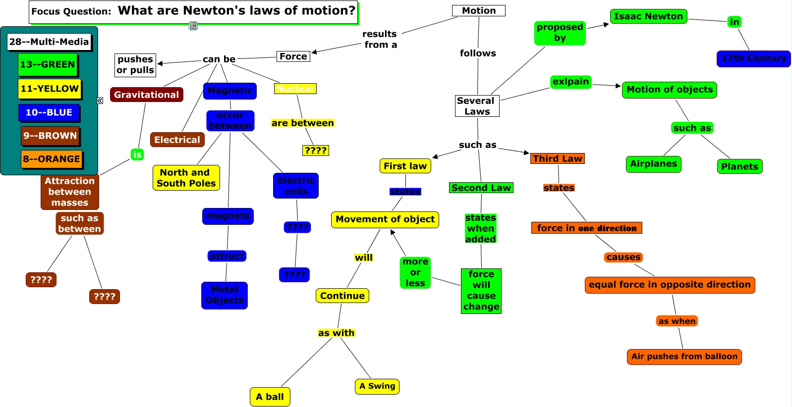 This Concept Map, created with IHMC CmapTools, has information related to: 2 6 10 14 18, force will cause change more or less Movement of object, Motion of objects such as Airplanes, Attraction between masses such as between ????, magnets attract Metal Objects, Third Law states force in one direction, Magnetic occur between magnets, Second Law states when added force will cause change, Magnetic occur between North and South Poles, Motion results from a Force, Attraction between masses such as between ????, Movement of object will Continue, Isaac Newton in 17th Century, Magnetic occur between Electric coils, Several Laws such as Second Law, Force can be Electrical, Continue as with A ball, Several Laws proposed by Isaac Newton, Nuclear are between ????, Several Laws such as Third Law, Force can be pushes or pulls