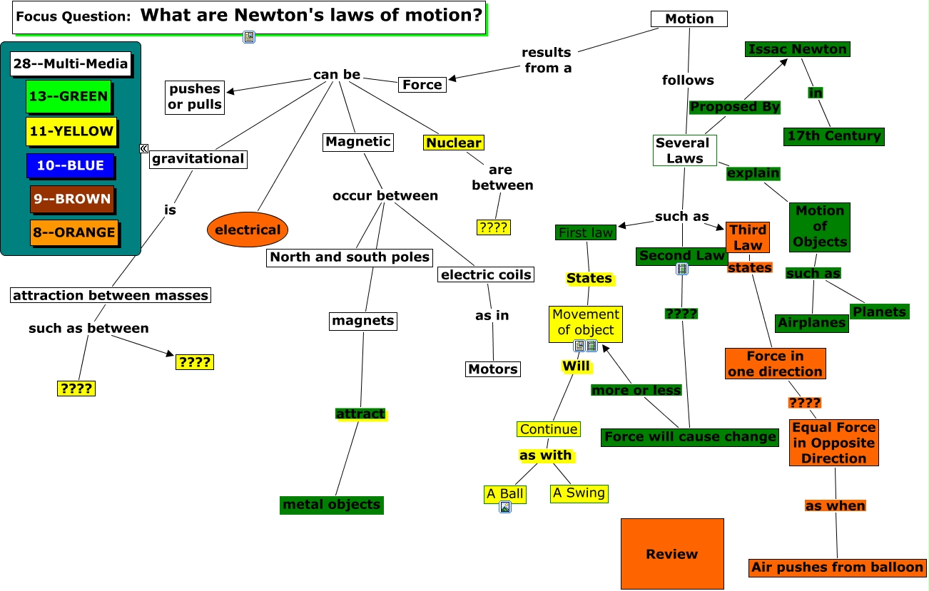 This Concept Map, created with IHMC CmapTools, has information related to: 3 7 11 15 19, Force can be electrical, Equal Force in Opposite Direction as when Air pushes from balloon, Motion of Objects such as Planets, Several Laws such as Third Law, attraction between masses such as between ????, Several Laws Proposed By Issac Newton, Motion results from a Force, First law States Movement of object, Several Laws such as Second Law, Force can be gravitational, Continue as with A Ball, Third Law states Force in one direction, attraction between masses such as between ????, electric coils as in Motors, Magnetic occur between North and south poles, Magnetic occur between magnets, Force can be Magnetic, Force can be pushes or pulls, Force in one direction ???? Equal Force in Opposite Direction, Force will cause change more or less Movement of object