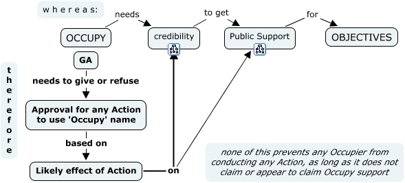 This Concept Map, created with IHMC CmapTools, has information related to: O_NameApprovalForActions, OCCUPY needs credibility, GA needs to give or refuse Approval for any Action to use 'Occupy' name, Likely effect of Action on Public Support, Likely effect of Action on credibility, Approval for any Action to use 'Occupy' name based on Likely effect of Action, credibility to get Public Support, Public Support for OBJECTIVES