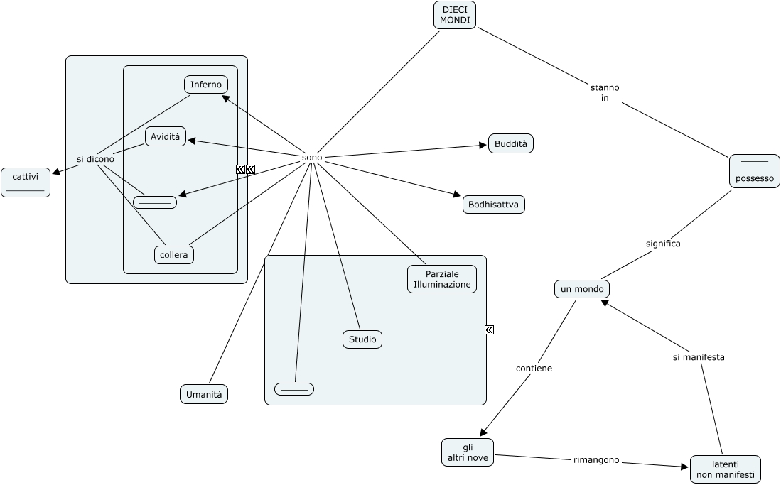 Questa Cmap, creata con IHMC CmapTools, contiene informazioni relative a: diecimondi, DIECI MONDI sono collera, collera si dicono cattivi _______, DIECI MONDI sono Studio, DIECI MONDI sono Bodhisattva, DIECI MONDI sono Parziale Illuminazione, DIECI MONDI sono _____, DIECI MONDI sono Inferno, latenti non manifesti si manifesta un mondo, DIECI MONDI sono ______, gli altri nove rimangono latenti non manifesti, DIECI MONDI stanno in _____ possesso, DIECI MONDI sono Umanità, ______ si dicono cattivi _______, Inferno si dicono cattivi _______, DIECI MONDI sono Avidità, _____ possesso significa un mondo, Avidità si dicono cattivi _______, un mondo contiene gli altri nove, DIECI MONDI sono Buddità