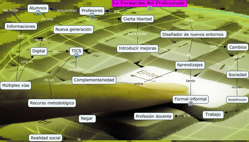 Este Cmap, tiene información relacionada con: Juan Barrios-Cintia Ojeda, La Formación del Profesorado los Profesores, Negar la Realidad social, Alumnos les llega Informaciones, TICS es un Recurso metodológico, Profesores encuentran Alumnos, Trabajo y la Profesión docente, Nueva generación que es Digital, Múltiples vías una es Digital, Diseñador de nuevos entornos de Aprendizajes, Cambios de la Sociedad, La Formación del Profesorado como Diseñador de nuevos entornos, Sociedad inciden Redefinición, Redefinición del Trabajo, Digital las TICS, Cierta libertad para poder Introducir mejoras, Diseñador de nuevos entornos por Cambios, Aprendizajes tanto Formal-informal, Profesores tienen Cierta libertad, Informaciones por Múltiples vías, Complementariedad entre Aprendizajes