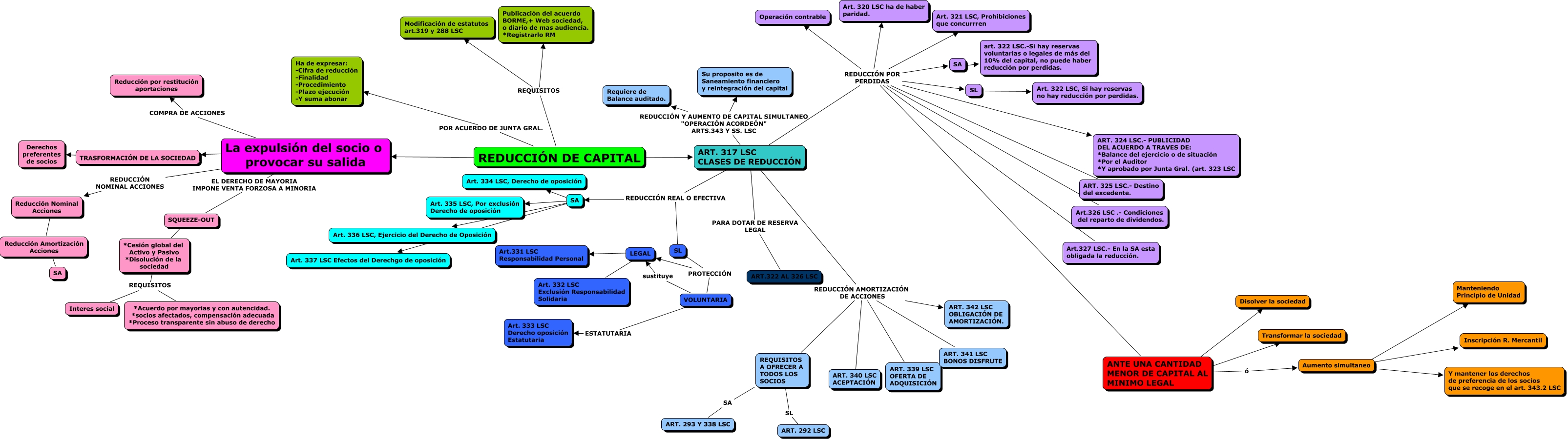 Este Cmap, tiene información relacionada con: 10.-Fem Net, ART. 317 LSC CLASES DE REDUCCIÓN REDUCCIÓN REAL O EFECTIVA SA, Reducción Nominal Acciones SA Reducción Amortización Acciones, ART. 317 LSC CLASES DE REDUCCIÓN REDUCCIÓN POR PERDIDAS SL, La expulsión del socio o provocar su salida ???? TRASFORMACIÓN DE LA SOCIEDAD, SA ???? Art. 334 LSC, Derecho de oposición, ART. 317 LSC CLASES DE REDUCCIÓN REDUCCIÓN AMORTIZACIÓN DE ACCIONES ART. 341 LSC BONOS DISFRUTE, REDUCCIÓN DE CAPITAL ???? ART. 317 LSC CLASES DE REDUCCIÓN, SQUEEZE-OUT ???? *Cesión global del Activo y Pasivo *Disolución de la sociedad, ART. 317 LSC CLASES DE REDUCCIÓN REDUCCIÓN AMORTIZACIÓN DE ACCIONES ART. 339 LSC OFERTA DE ADQUISICIÓN, La expulsión del socio o provocar su salida REDUCCIÓN NOMINAL ACCIONES Reducción Nominal Acciones, ANTE UNA CANTIDAD MENOR DE CAPITAL AL MINIMO LEGAL ???? Transformar la sociedad, LEGAL ???? Art.331 LSC Responsabilidad Personal, SA ???? Art. 335 LSC, Por exclusión Derecho de oposición, *Cesión global del Activo y Pasivo *Disolución de la sociedad REQUISITOS Interes social, REDUCCIÓN DE CAPITAL REQUISITOS Modificación de estatutos art.319 y 288 LSC, TRASFORMACIÓN DE LA SOCIEDAD ???? Derechos preferentes de socios, SL PROTECCIÓN LEGAL, La expulsión del socio o provocar su salida EL DERECHO DE MAYORIA IMPONE VENTA FORZOSA A MINORIA SQUEEZE-OUT, Aumento simultaneo ???? Y mantener los derechos de preferencia de los socios que se recoge en el art. 343.2 LSC, *Cesión global del Activo y Pasivo *Disolución de la sociedad REQUISITOS *Acuerdo por mayorias y con autencidad. *socios afectados, compensación adecuada *Proceso transparente sin abuso de derecho