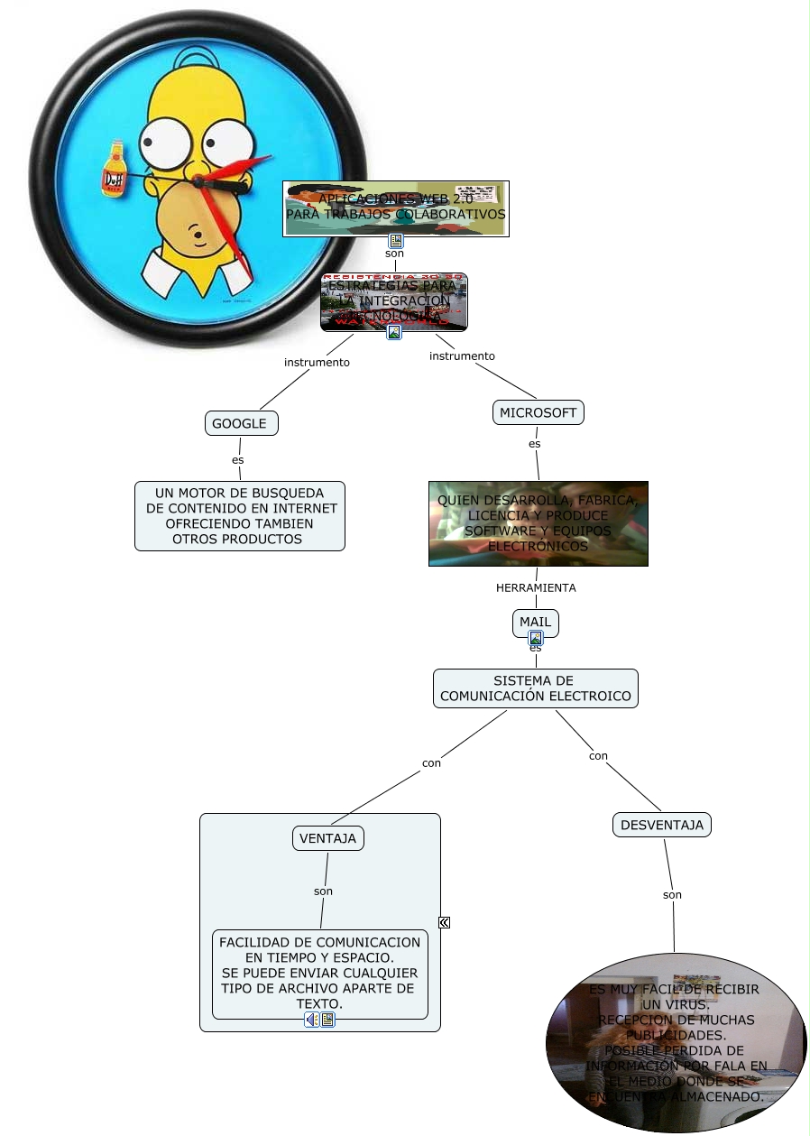 Este Cmap, tiene información relacionada con: trabajo, QUIEN DESARROLLA, FABRICA, LICENCIA Y PRODUCE SOFTWARE Y EQUIPOS ELECTRÓNICOS HERRAMIENTA MAIL, SISTEMA DE COMUNICACIÓN ELECTROICO con DESVENTAJA, VENTAJA son FACILIDAD DE COMUNICACION EN TIEMPO Y ESPACIO. SE PUEDE ENVIAR CUALQUIER TIPO DE ARCHIVO APARTE DE TEXTO., SISTEMA DE COMUNICACIÓN ELECTROICO con VENTAJA, GOOGLE es UN MOTOR DE BUSQUEDA DE CONTENIDO EN INTERNET OFRECIENDO TAMBIEN OTROS PRODUCTOS, APLICACIONES WEB 2.0 PARA TRABAJOS COLABORATIVOS son ESTRATEGIAS PARA LA INTEGRACION TECNOLÓGICA, MICROSOFT es QUIEN DESARROLLA, FABRICA, LICENCIA Y PRODUCE SOFTWARE Y EQUIPOS ELECTRÓNICOS, MAIL es SISTEMA DE COMUNICACIÓN ELECTROICO, ESTRATEGIAS PARA LA INTEGRACION TECNOLÓGICA instrumento MICROSOFT, DESVENTAJA son ES MUY FACIL DE RECIBIR UN VIRUS. RECEPCION DE MUCHAS PUBLICIDADES. POSIBLE PERDIDA DE INFORMACIÓN POR FALA EN EL MEDIO DONDE SE ENCUENTRA ALMACENADO., ESTRATEGIAS PARA LA INTEGRACION TECNOLÓGICA instrumento GOOGLE
