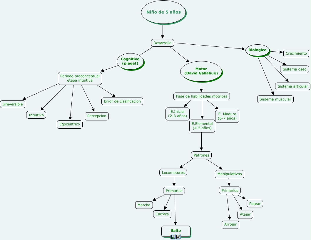 Este Cmap, tiene información relacionada con: NIÑOS DE 5 AÑOS, Biologico ???? Sistema muscular, Biologico ???? Sistema articular, Fase de habilidades motrices ???? E. Maduro (6-7 años), Motor (David Gallahue) ???? Fase de habilidades motrices, E.Elemental (4-5 años) ???? Patrones, Patrones ???? Manipulativos, Patrones ???? Locomotores, Cognitivo (piaget) ???? Periodo preconceptual etapa intuitiva, Periodo preconceptual etapa intuitiva ???? Egocentrico, Locomotores ???? Primarios, Periodo preconceptual etapa intuitiva ???? Percepcion, Periodo preconceptual etapa intuitiva ???? Irreversible, Desarrollo ???? Biologico, Primarios ???? Arrojar, Primarios ???? Carrera, Fase de habilidades motrices ???? E.Elemental (4-5 años), Primarios ???? Patear, Desarrollo ???? Cognitivo (piaget), Primarios ???? Marcha, Periodo preconceptual etapa intuitiva ???? Intuitivo