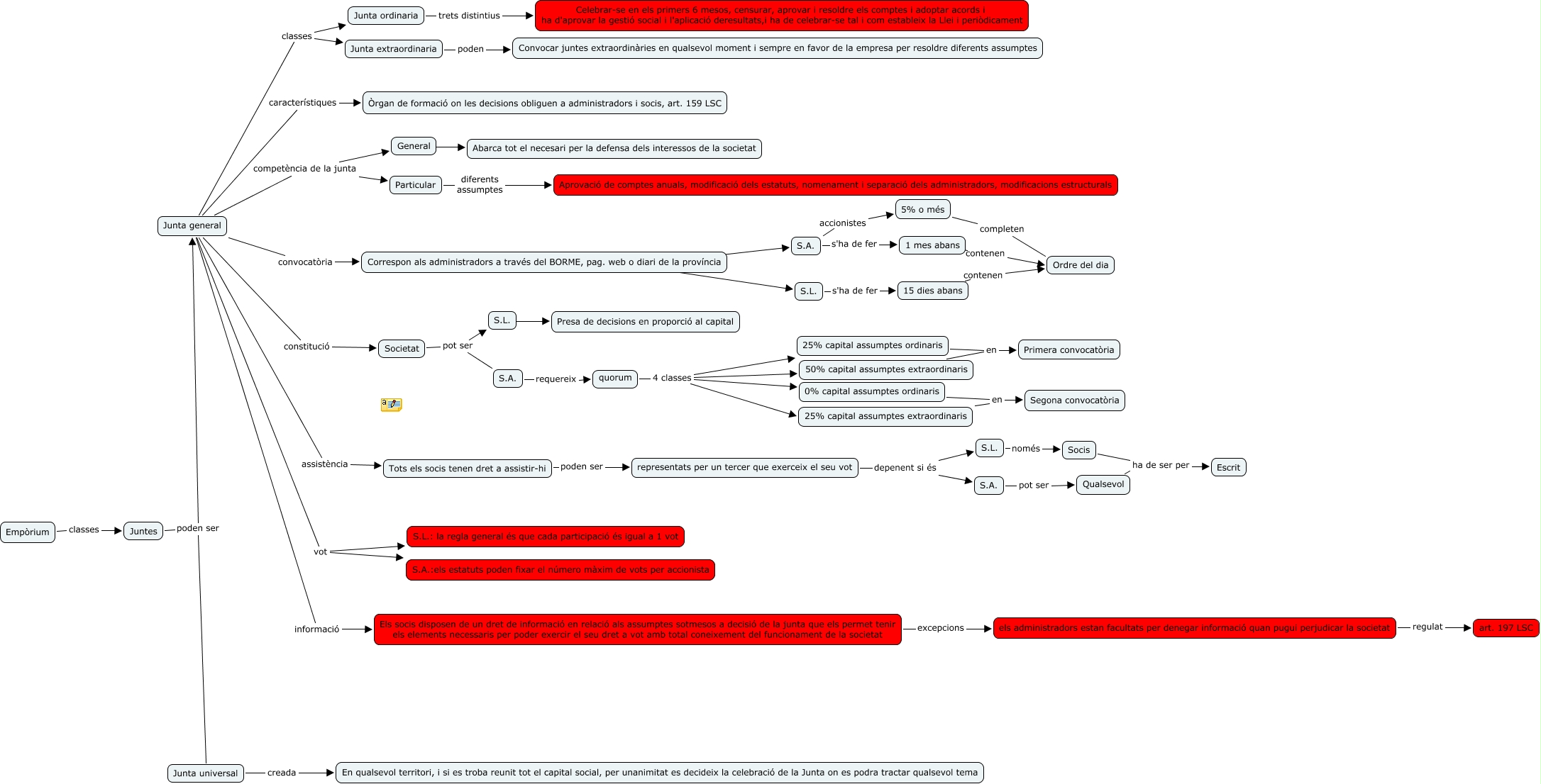 Este Cmap, tiene información relacionada con: Cmap 4 Corregit, Junta extraordinaria poden Convocar juntes extraordinàries en qualsevol moment i sempre en favor de la empresa per resoldre diferents assumptes, Socis ha de ser per Escrit, S.A. s'ha de fer 1 mes abans, quorum 4 classes 50% capital assumptes extraordinaris, Juntes poden ser Junta general, Qualsevol ha de ser per Escrit, S.A. requereix quorum, 1 mes abans contenen Ordre del dia, Junta general convocatòria Correspon als administradors a través del BORME, pag. web o diari de la província, Junta general classes Junta ordinaria, Correspon als administradors a través del BORME, pag. web o diari de la província ???? S.L., 50% capital assumptes extraordinaris en Primera convocatòria, General ???? Abarca tot el necesari per la defensa dels interessos de la societat, S.A. accionistes 5% o més, Empòrium classes Juntes, S.L. s'ha de fer 15 dies abans, representats per un tercer que exerceix el seu vot depenent si és S.L., S.L. ???? Presa de decisions en proporció al capital, Junta general classes Junta extraordinaria, Tots els socis tenen dret a assistir-hi poden ser representats per un tercer que exerceix el seu vot