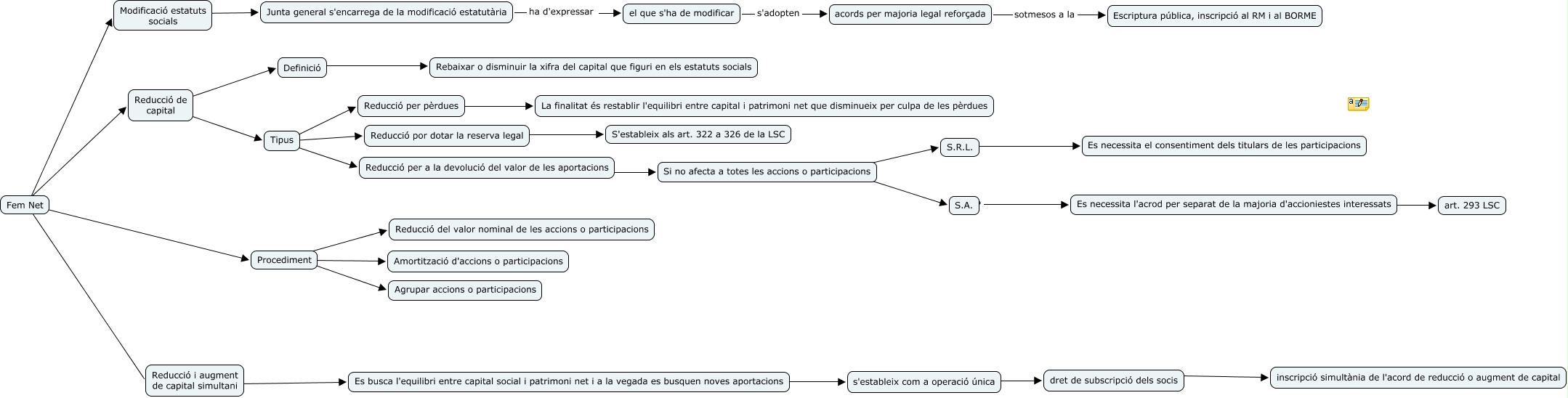 Este Cmap, tiene información relacionada con: Cmap nº 10, Reducció de capital ???? Tipus, Reducció por dotar la reserva legal ???? S'estableix als art. 322 a 326 de la LSC, Si no afecta a totes les accions o participacions ???? S.R.L., Reducció per pèrdues ???? La finalitat és restablir l'equilibri entre capital i patrimoni net que disminueix per culpa de les pèrdues, Procediment ???? Amortització d'accions o participacions, Fem Net ???? Modificació estatuts socials, Procediment ???? Reducció del valor nominal de les accions o participacions, Junta general s'encarrega de la modificació estatutària ha d'expressar el que s'ha de modificar, acords per majoria legal reforçada sotmesos a la Escriptura pública, inscripció al RM i al BORME, Reducció per a la devolució del valor de les aportacions ???? Si no afecta a totes les accions o participacions, el que s'ha de modificar s'adopten acords per majoria legal reforçada, dret de subscripció dels socis ???? inscripció simultània de l'acord de reducció o augment de capital, Tipus ???? Reducció per a la devolució del valor de les aportacions, Reducció de capital ???? Definició, Si no afecta a totes les accions o participacions ???? S.A., Modificació estatuts socials ???? Junta general s'encarrega de la modificació estatutària, Fem Net ???? Procediment, Es necessita l'acrod per separat de la majoria d'accioniestes interessats ???? art. 293 LSC, Es busca l'equilibri entre capital social i patrimoni net i a la vegada es busquen noves aportacions ???? s'estableix com a operació única, Procediment ???? Agrupar accions o participacions