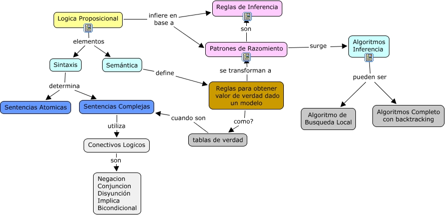 Este Cmap, tiene información relacionada con: LogicaProposicional, Sintaxis determina Sentencias Complejas, Logica Proposicional elementos Sintaxis, tablas de verdad cuando son Sentencias Complejas, Logica Proposicional infiere en base a Reglas de Inferencia, Reglas para obtener valor de verdad dado un modelo se transforman a Patrones de Razomiento, Patrones de Razomiento surge Algoritmos Inferencia, Sintaxis determina Sentencias Atomicas, Algoritmos Inferencia pueden ser Algoritmos Completo con backtracking, Logica Proposicional infiere en base a Patrones de Razomiento, Patrones de Razomiento son Reglas de Inferencia, Semántica define Reglas para obtener valor de verdad dado un modelo, Algoritmos Inferencia pueden ser Algoritmo de Busqueda Local, Conectivos Logicos son Negacion Conjuncion Disyunción Implica Bicondicional, Reglas para obtener valor de verdad dado un modelo como? tablas de verdad, Sentencias Complejas utiliza Conectivos Logicos, Logica Proposicional elementos Semántica