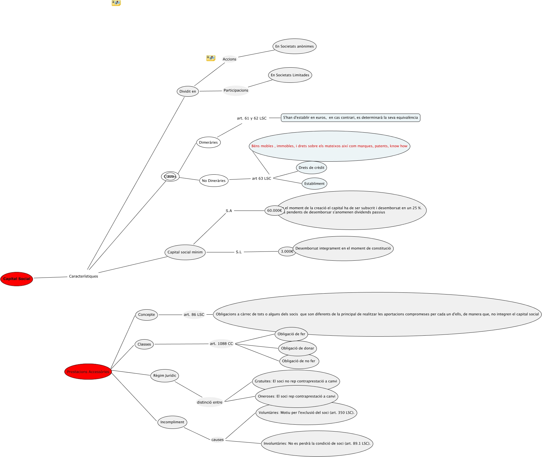 Este Cmap, tiene información relacionada con: cmap 2 corregit, Prestacions Accessòries _ Concepte, Incompliment causes Involuntàries: No es perdrà la condició de soci (art. 89.1 LSC)., No Dineràries art 63 LSC Béns mobles , immobles, i drets sobre els mateixos així com marques, patents, know how, Règim Jurídic distinció entre Gratuites: El soci no rep contraprestació a canvi, Classes art. 1088 CC Obligació de no fer, Incompliment causes Voluntàries: Motiu per l'exclusió del soci (art. 350 LSC)., Règim Jurídic distinció entre Oneroses: El soci rep contraprestació a canvi, No Dineràries art 63 LSC Establiment, No Dineràries art 63 LSC Drets de crèdit, Concepte art. 86 LSC Obligacions a càrrec de tots o alguns dels socis que son diferents de la principal de realitzar les aportacions compromeses per cada un d'ells, de manera que, no integren el capital social, Incompliment _ Règim Jurídic, Capital Social Característiques ????, Classes art. 1088 CC Obligació de donar, Classes _ Concepte, Classes _ Règim Jurídic, Classes ???? No Dineràries, Dimeràries art. 61 y 62 LSC S'han d'establir en euros, en cas contrari, es determinarà la seva equivalència, Incompliment _ Concepte, Dividit en Participacions En Societats Limitades, Capital Social Característiques Capital social mínim