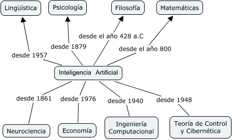 Este Cmap, tiene información relacionada con: disciplinas e IA, Inteligencia Artificial desde 1879 Psicología, Inteligencia Artificial desde 1861 Neurociencia, Inteligencia Artificial desde 1948 Teoría de Control y Cibernética, Inteligencia Artificial desde 1957 Lingüística, Inteligencia Artificial desde 1976 Economía, Inteligencia Artificial desde el año 800 Matemáticas, Inteligencia Artificial desde 1940 Ingeniería Computacional, Inteligencia Artificial desde el año 428 a.C Filosofía