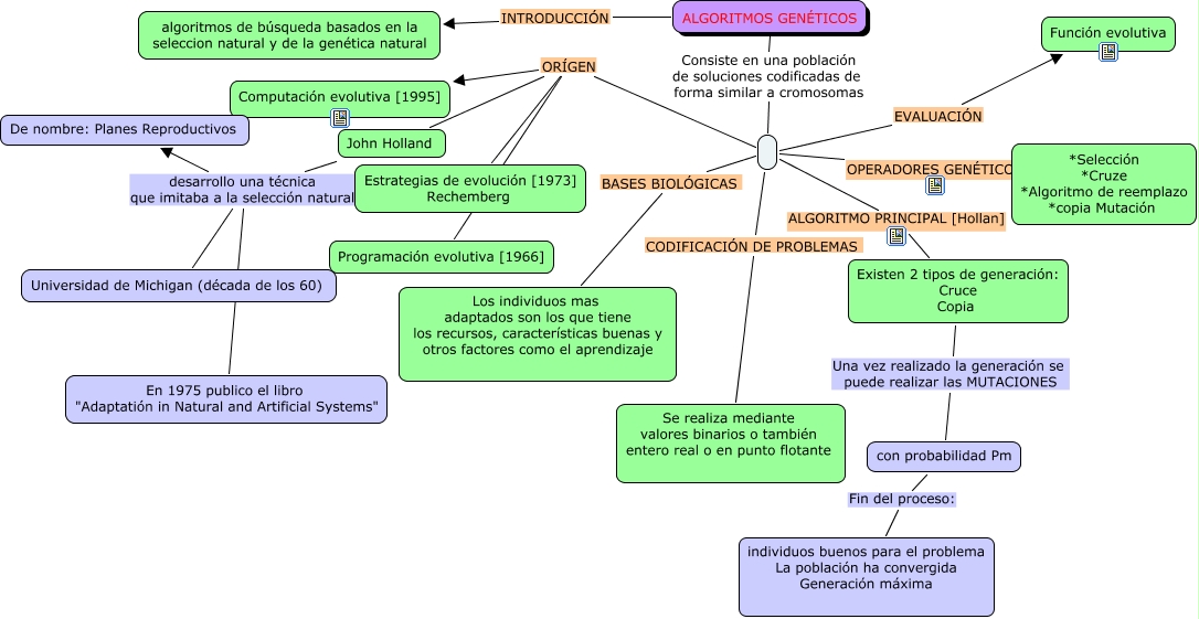 Este Cmap, tiene información relacionada con: algoritmos geneticos, ALGORITMO PRINCIPAL [Hollan] Existen 2 tipos de generación: Cruce Copia, ALGORITMOS GENÉTICOS INTRODUCCIÓN algoritmos de búsqueda basados en la seleccion natural y de la genética natural, con probabilidad Pm Fin del proceso: individuos buenos para el problema La población ha convergida Generación máxima, ORÍGEN John Holland, John Holland desarrollo una técnica que imitaba a la selección natural De nombre: Planes Reproductivos, BASES BIOLÓGICAS Los individuos mas adaptados son los que tiene los recursos, características buenas y otros factores como el aprendizaje, John Holland desarrollo una técnica que imitaba a la selección natural En 1975 publico el libro "Adaptatión in Natural and Artificial Systems", Existen 2 tipos de generación: Cruce Copia Una vez realizado la generación se puede realizar las MUTACIONES con probabilidad Pm, EVALUACIÓN Función evolutiva, ORÍGEN Programación evolutiva [1966], CODIFICACIÓN DE PROBLEMAS Se realiza mediante valores binarios o también entero real o en punto flotante, ALGORITMOS GENÉTICOS Consiste en una población de soluciones codificadas de forma similar a cromosomas, ORÍGEN Computación evolutiva [1995], John Holland desarrollo una técnica que imitaba a la selección natural Universidad de Michigan (década de los 60), ORÍGEN Estrategias de evolución [1973] Rechemberg, OPERADORES GENÉTICOS *Selección *Cruze *Algoritmo de reemplazo *copia Mutación