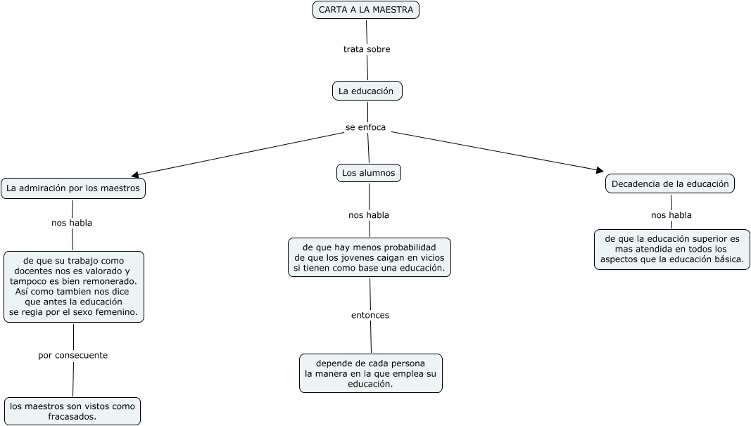 Este Cmap, tiene información relacionada con: carta a la maestra, de que su trabajo como docentes nos es valorado y tampoco es bien remonerado. Así como tambien nos dice que antes la educación se regia por el sexo femenino. por consecuente los maestros son vistos como fracasados., CARTA A LA MAESTRA trata sobre La educación, La educación se enfoca Decadencia de la educación, La educación se enfoca La admiración por los maestros, La educación se enfoca Los alumnos, de que hay menos probabilidad de que los jovenes caigan en vicios si tienen como base una educación. entonces depende de cada persona la manera en la que emplea su educación., La admiración por los maestros nos habla de que su trabajo como docentes nos es valorado y tampoco es bien remonerado. Así como tambien nos dice que antes la educación se regia por el sexo femenino., Decadencia de la educación nos habla de que la educación superior es mas atendida en todos los aspectos que la educación básica., Los alumnos nos habla de que hay menos probabilidad de que los jovenes caigan en vicios si tienen como base una educación.