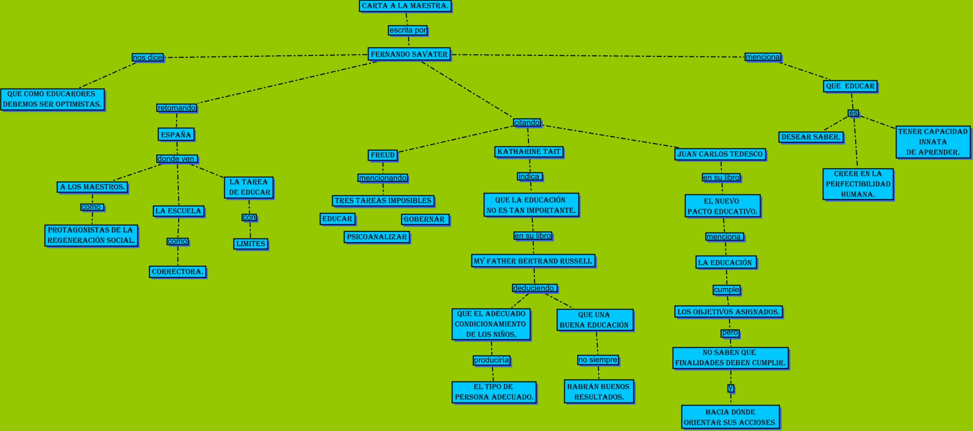 Este Cmap, tiene información relacionada con: Carta a la maestra, España donde ven La escuela, Fernando Savater menciona Que educar, Freud mencionando tres tareas imposibles, My father bertrand russell deduciendo Que el adecuado condicionamiento de los niños., España donde ven La tarea de educar, La tarea de educar con Limites, Juan Carlos Tedesco citando Katharine Tait, No saben que finalidades deben cumplir. y Hacia dónde orientar sus acciones, Los objetivos asignados. pero No saben que finalidades deben cumplir., El nuevo pacto educativo. menciona La educación, Fernando Savater citando Katharine Tait, Que educar es Creer en la perfectibilidad humana., Fernando Savater retomando España, CARTA A LA MAESTRA. escrita por Fernando Savater, Freud citando Katharine Tait, My father bertrand russell deduciendo Que una buena educación, Que educar es Desear saber., Que el adecuado condicionamiento de los niños. produciría El tipo de persona adecuado., Que la educación no es tan importante. en su libro My father bertrand russell, La educación cumple Los objetivos asignados.