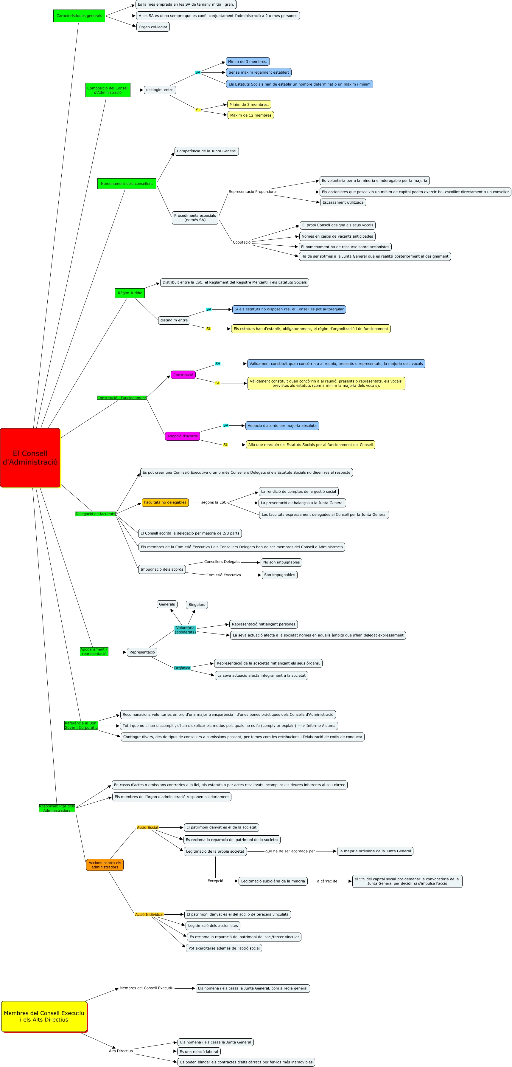 Este Cmap, tiene información relacionada con: Cas 9 Lluís Ricart, distingim entre SA Sense màxim legalment establert, El Consell d'Administració Característiques generals Es la més emprada en les SA de tamany mitjà i gran., El Consell d'Administració Delegació de facultats Impugnació dels acords, Adopció d'acords SL Allò que marquin els Estatuts Socials per al funcionament del Consell, Accions contra els administradors Acció Social Legitimació de la propia societat, El Consell d'Administració Nomenament dels consellers Procediments especials (només SA), distingim entre SA Mínim de 3 membres., Legitimació de la propia societat Excepció Legitimació subidiària de la minoria, Facultats no delegables segons la LSC Les facultats expressament delegades al Consell per la Junta General, Constitució SA Vàlidament constituit quan concòrrin a al reunió, presents o representats, la majoria dels vocals, Accions contra els administradors Acció Social El patrimoni danyat es el de la societat, El Consell d'Administració Delegació de facultats Facultats no delegables, El Consell d'Administració Règim Jurídic distingim entre, Membres del Consell Executiu i els Alts Directius Membres del Consell Executiu Els nomena i els cessa la Junta General, com a regla general, Accions contra els administradors Acció Social Es reclama la reparació del patrimoni de la societat, distingim entre SL Mínim de 3 membres., Procediments especials (només SA) Cooptació Només en casos de vacants anticipades, El Consell d'Administració Constitució i Funcionament Adopció d'acords, Representació Voluntària (apoderats) La seva actuació afecta a la societat nomès en aquells àmbits que s'han delegat expressament, El Consell d'Administració Característiques generals A les SA es dona sempre que es confii conjuntament l'administració a 2 o més persones
