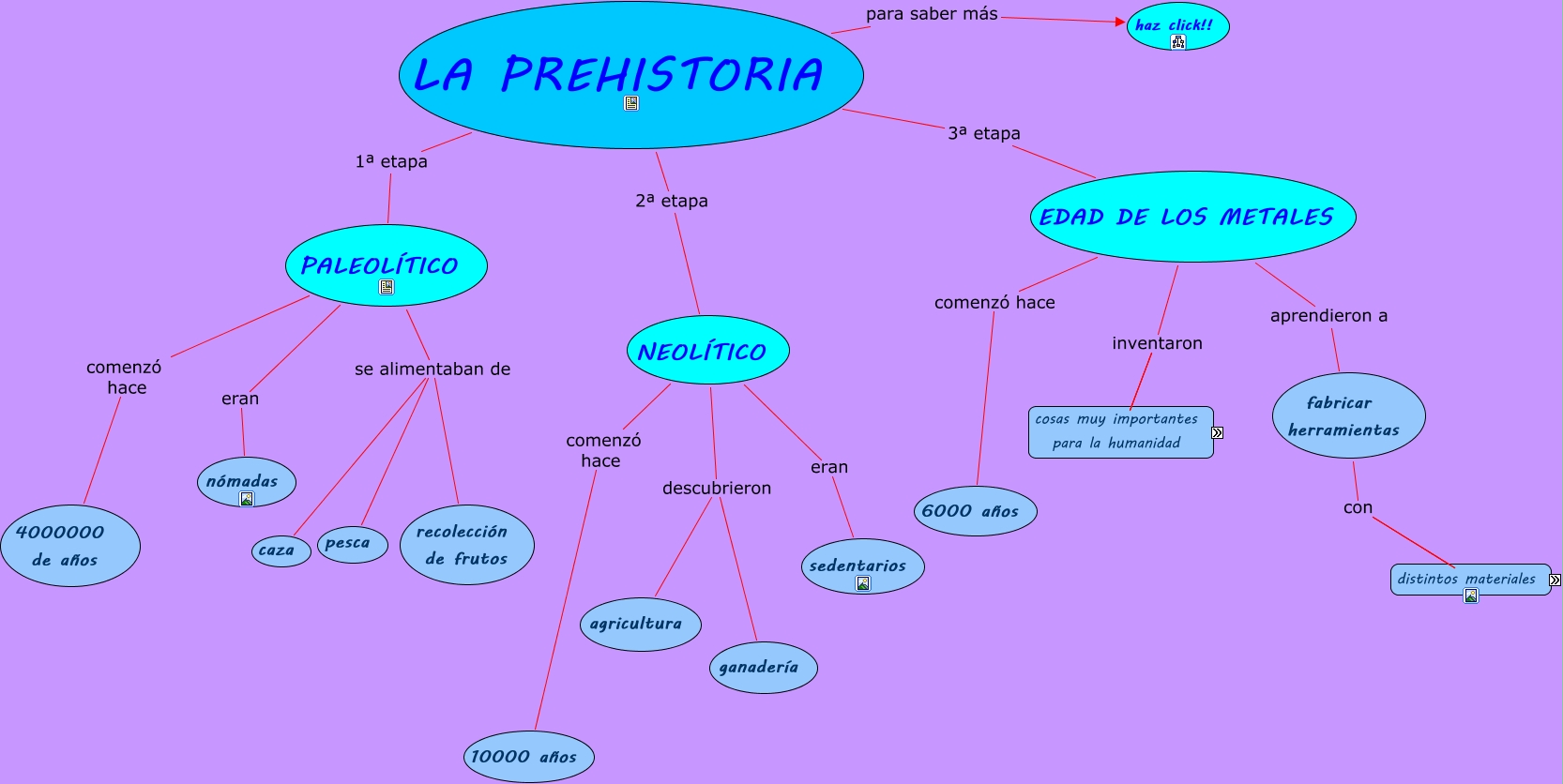 Este Cmap, tiene información relacionada con: LA PREHISTORIA, NEOLÍTICO descubrieron ganadería, PALEOLÍTICO eran nómadas, LA PREHISTORIA 3ª etapa EDAD DE LOS METALES, EDAD DE LOS METALES comenzó hace 6000 años, PALEOLÍTICO comenzó hace 4000000 de años, EDAD DE LOS METALES inventaron la rueda, EDAD DE LOS METALES aprendieron a fabricar herramientas, EDAD DE LOS METALES inventaron el arado, NEOLÍTICO comenzó hace 10000 años, PALEOLÍTICO se alimentaban de caza, fabricar herramientas con bronce, PALEOLÍTICO se alimentaban de pesca, PALEOLÍTICO se alimentaban de recolección de frutos, LA PREHISTORIA 1ª etapa PALEOLÍTICO, fabricar herramientas con hierro, LA PREHISTORIA para saber más haz click!!, NEOLÍTICO descubrieron agricultura, EDAD DE LOS METALES inventaron el barco de vela, NEOLÍTICO eran sedentarios, LA PREHISTORIA 2ª etapa NEOLÍTICO