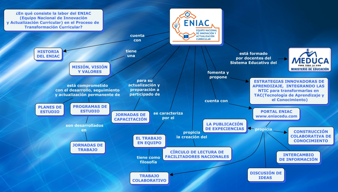 Este Cmap, tiene información relacionada con: mapa_principal_eniac, EL TRABAJO EN EQUIPO tiene como filosofía TRABAJO COLABORATIVO, PORTAL ENIAC www.eniacedu.com propicia LA PUBLICACIÓN DE EXPECIENCIAS, PORTAL ENIAC www.eniacedu.com propicia DISCUSIÓN DE IDEAS, se caracteriza por el EL TRABAJO EN EQUIPO, PORTAL ENIAC www.eniacedu.com propicia TRABAJO COLABORATIVO, PORTAL ENIAC www.eniacedu.com propicia INTERCAMBIO DE INFORMACIÓN, cuenta con PORTAL ENIAC www.eniacedu.com, está comprometido con el desarrollo, seguimiento y actualización permanente de PLANES DE ESTUDIO, tiene una MISIÓN, VISIÓN Y VALORES, propicia la creación del CÍRCULO DE LECTURA DE FACILITADORES NACIONALES, cuenta con HISTORIA DEL ENIAC, está comprometido con el desarrollo, seguimiento y actualización permanente de PROGRAMAS DE ESTUDIO, PROGRAMAS DE ESTUDIO son desarrollados en JORNADAS DE TRABAJO, para su actualización y preparación a participado de JORNADAS DE CAPACITACIÓN, PORTAL ENIAC www.eniacedu.com propicia CONSTRUCCIÓN COLABORATIVA DE CONOCIMIENTO, fomenta y propone ESTRATEGIAS INNOVADORAS DE APRENDIZAJE, INTEGRANDO LAS NTIC para transformarlas en TAC(Tecnología de Aprendizaje y el Conocimiento), está formado por docentes del Sistema Educativo del