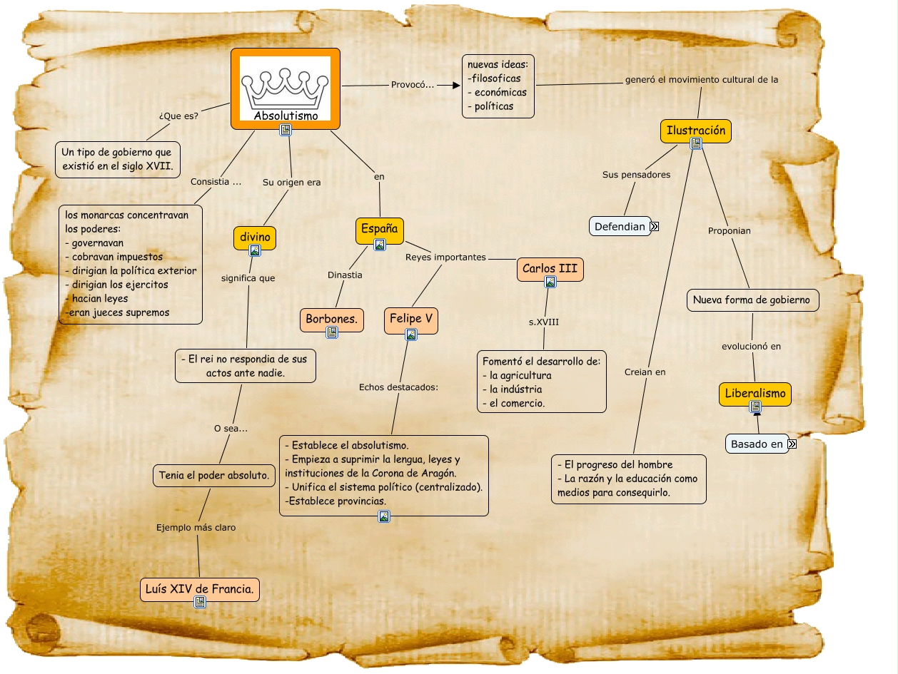 Este Cmap, tiene información relacionada con: Medi tema 8 absol y ilust, Tenia el poder absoluto. Ejemplo más claro Luís XIV de Francia., España Reyes importantes Carlos III, Felipe V Echos destacados: - Establece el absolutismo. - Empieza a suprimir la lengua, leyes y instituciones de la Corona de Aragón. - Unifica el sistema político (centralizado). -Establece provincias., Ilustración Sus pensadores Defendian, divino significa que - El rei no respondia de sus actos ante nadie., España Dinastia Borbones., Ilustración Proponian Nueva forma de gobierno, Nueva forma de gobierno evolucionó en Liberalismo, España Reyes importantes Felipe V, Ilustración Creian en - El progreso del hombre - La razón y la educación como medios para consequirlo., Absolutismo Consistia ... los monarcas concentravan los poderes: - governavan - cobravan impuestos - dirigian la política exterior - dirigian los ejercitos - hacian leyes -eran jueces supremos, nuevas ideas: -filosoficas - económicas - políticas generó el movimiento cultural de la Ilustración, Carlos III s.XVIII Fomentó el desarrollo de: - la agricultura - la indústria - el comercio., Absolutismo Provocó... nuevas ideas: -filosoficas - económicas - políticas, Absolutismo ¿Que es? Un tipo de gobierno que existió en el siglo XVII., Absolutismo Su origen era divino, - El rei no respondia de sus actos ante nadie. O sea... Tenia el poder absoluto., Absolutismo en España, Basado en ???? Liberalismo