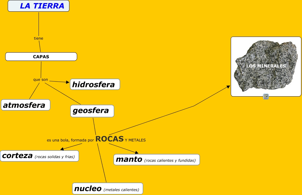 Questa Cmap, creata con IHMC CmapTools, contiene informazioni relative a: las rocas, CAPAS que son geosfera, LA TIERRA tiene CAPAS, geosfera es una bola, formada por ROCAS Y METALES corteza(rocas solidas y frias), geosfera es una bola, formada por ROCAS Y METALES manto(rocas calientes y fundidas), geosfera es una bola, formada por ROCAS Y METALES LOS MINERALES, CAPAS que son hidrosfera, CAPAS que son atmosfera, geosfera es una bola, formada por ROCAS Y METALES nucleo(metales calientes)