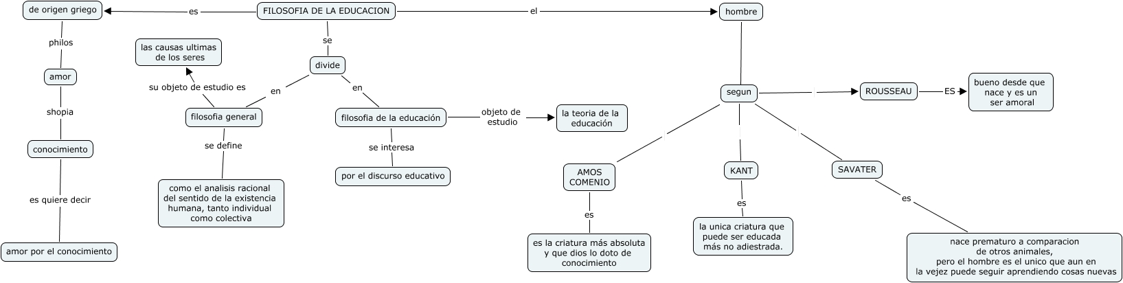Este Cmap, tiene información relacionada con: filosofia, conocimiento es quiere decir amor por el conocimiento, hombre segun, segun SAVATER, segun ROUSSEAU, amor shopia conocimiento, filosofia de la educación se interesa por el discurso educativo, FILOSOFIA DE LA EDUCACION se divide, FILOSOFIA DE LA EDUCACION el hombre, filosofia general se define como el analisis racional del sentido de la existencia humana, tanto individual como colectiva, filosofia de la educación objeto de estudio la teoria de la educación, KANT es la unica criatura que puede ser educada más no adiestrada., ROUSSEAU ES bueno desde que nace y es un ser amoral, divide en filosofia de la educación, FILOSOFIA DE LA EDUCACION es de origen griego, AMOS COMENIO es es la criatura más absoluta y que dios lo doto de conocimiento, segun KANT, segun AMOS COMENIO, SAVATER es nace prematuro a comparacion de otros animales, pero el hombre es el unico que aun en la vejez puede seguir aprendiendo cosas nuevas, de origen griego philos amor, divide en filosofia general